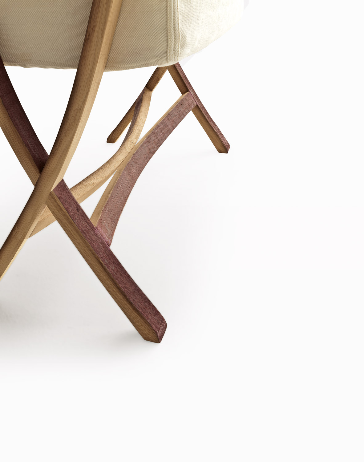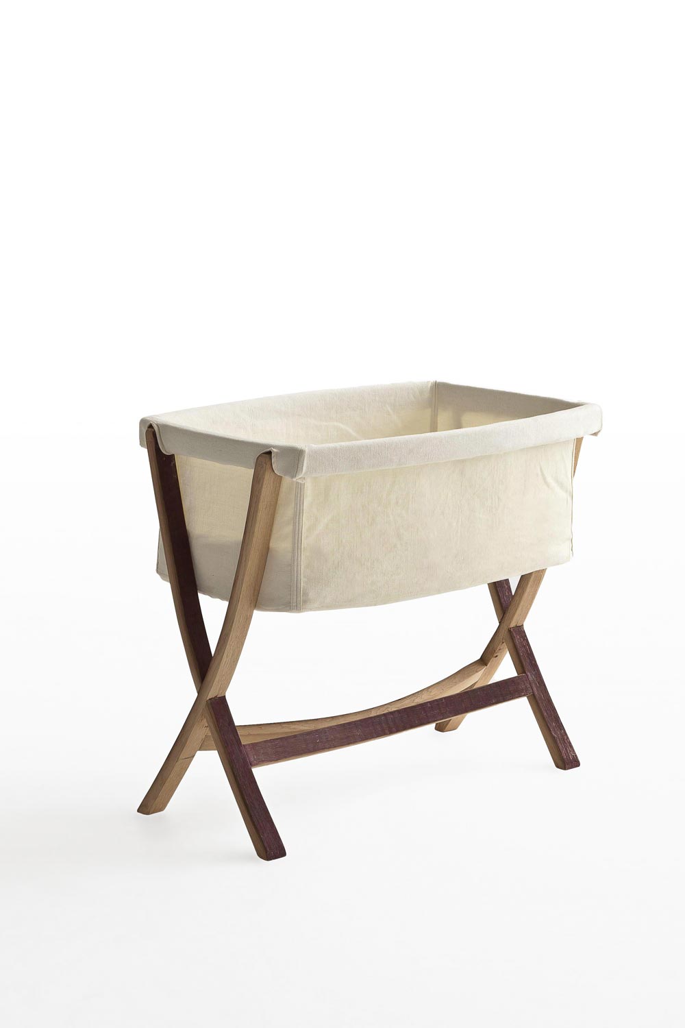 Berceau avec structure en "X" créée par les bois courbes des barriques, qui se rejoignent pour soutenir le "sac" en tissu qui donne du confort au berceau. Disponible avec ou sans base à bascule