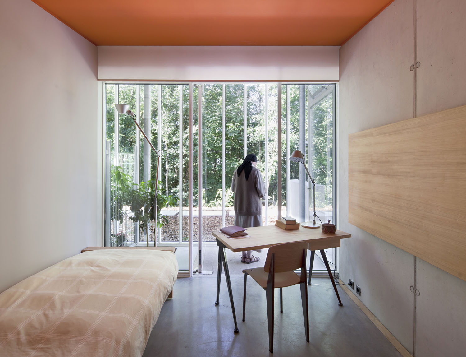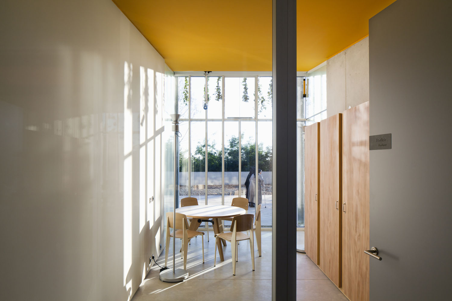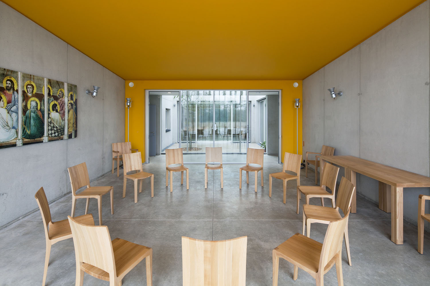 Du béton, du bois et puis de la lumière: de ces matériaux simples et élémentaires est né le couvent des Clarisses à Ronchamp, à côté de la Chapelle conçue par l'architecte Le Corbusier, projété par l'Arch.Renzo Piano et pour lequel Riva1920 a collaboré en fournissant tout le mobilier sur mesure, fabriqué en multipli plaqué de peuplier provenant des abattages programmés, en utilisant des colles vinyliques sans formaldéhyde et des finitions à base de huiles et des cires naturelles, en incorporant des éléments d'ébénisterie traditionnels tels que les joints verticaux en queue d'aronde pour les plinthes et les tiroirs en bois massif, fabriqués du même bois que le meuble.