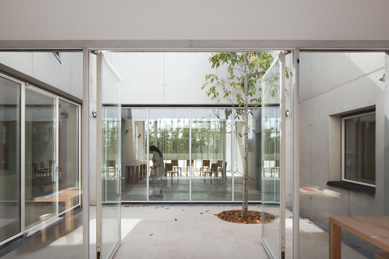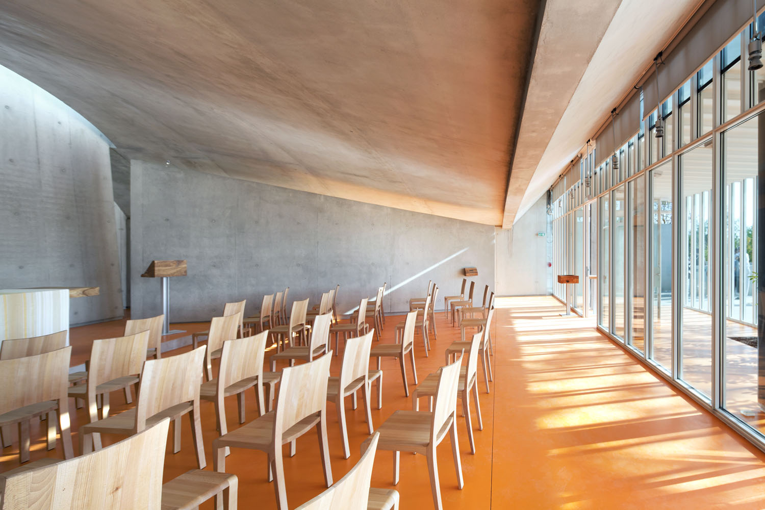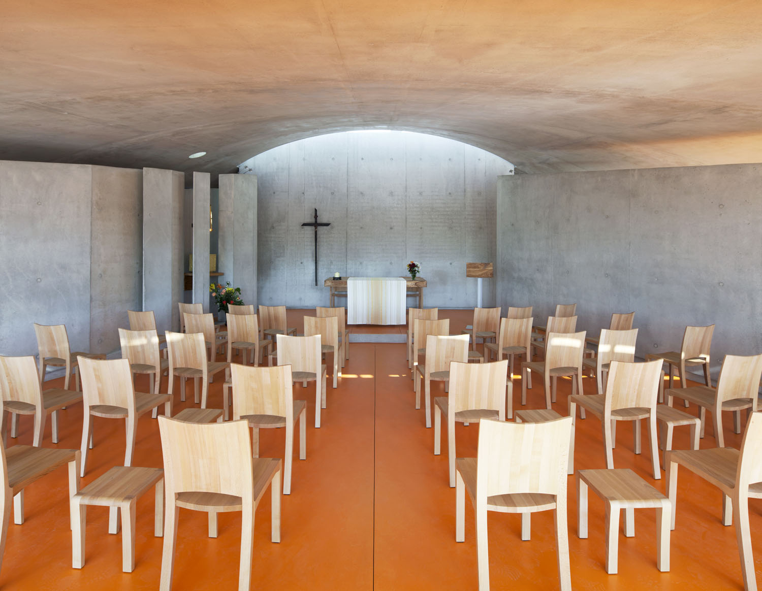 Du béton, du bois et puis de la lumière: de ces matériaux simples et élémentaires est né le couvent des Clarisses à Ronchamp, à côté de la Chapelle conçue par l'architecte Le Corbusier, projété par l'Arch.Renzo Piano et pour lequel Riva1920 a collaboré en fournissant tout le mobilier sur mesure, fabriqué en multipli plaqué de peuplier provenant des abattages programmés, en utilisant des colles vinyliques sans formaldéhyde et des finitions à base de huiles et des cires naturelles, en incorporant des éléments d'ébénisterie traditionnels tels que les joints verticaux en queue d'aronde pour les plinthes et les tiroirs en bois massif, fabriqués du même bois que le meuble.