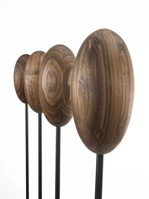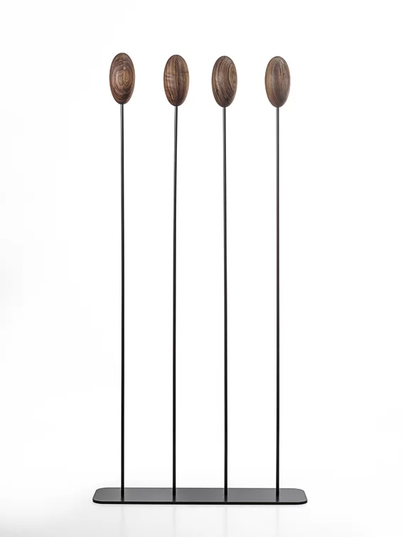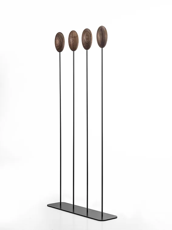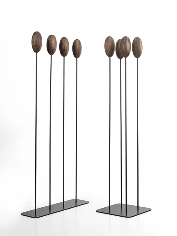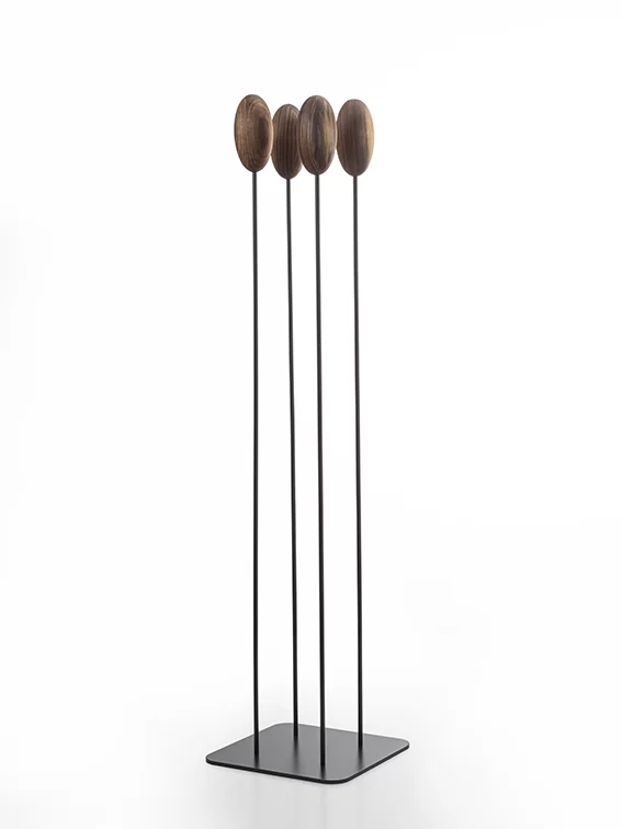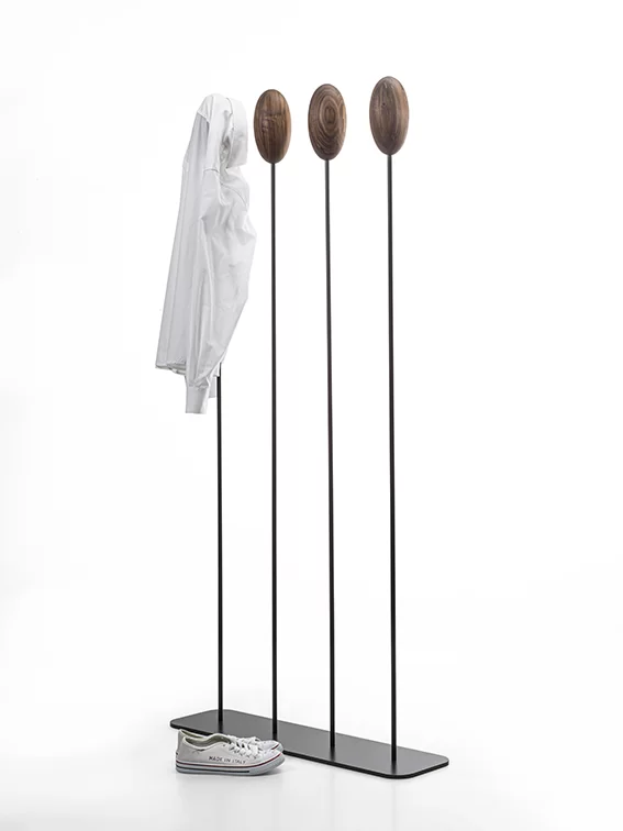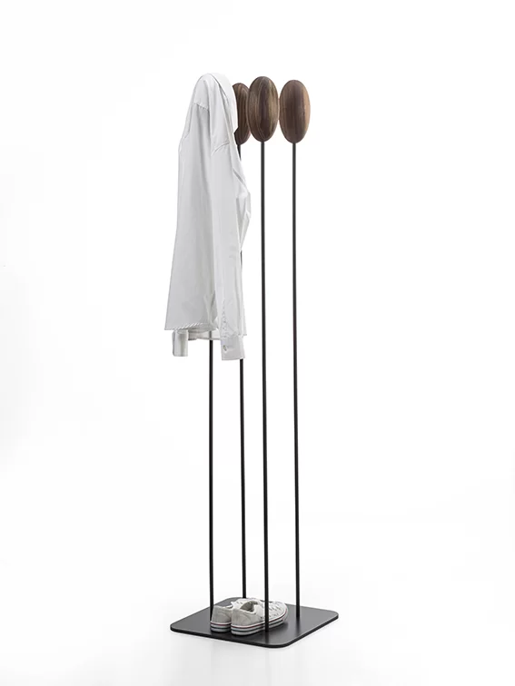 Appendiabiti con basamento e sostegni centrale verticali flessibili in ferro sormontati da un uovo realizzato in legno massello a liste incollate, che va a sostituire i classici ganci. Disponibile in due versioni: con basamento quadrato o rettangolare.