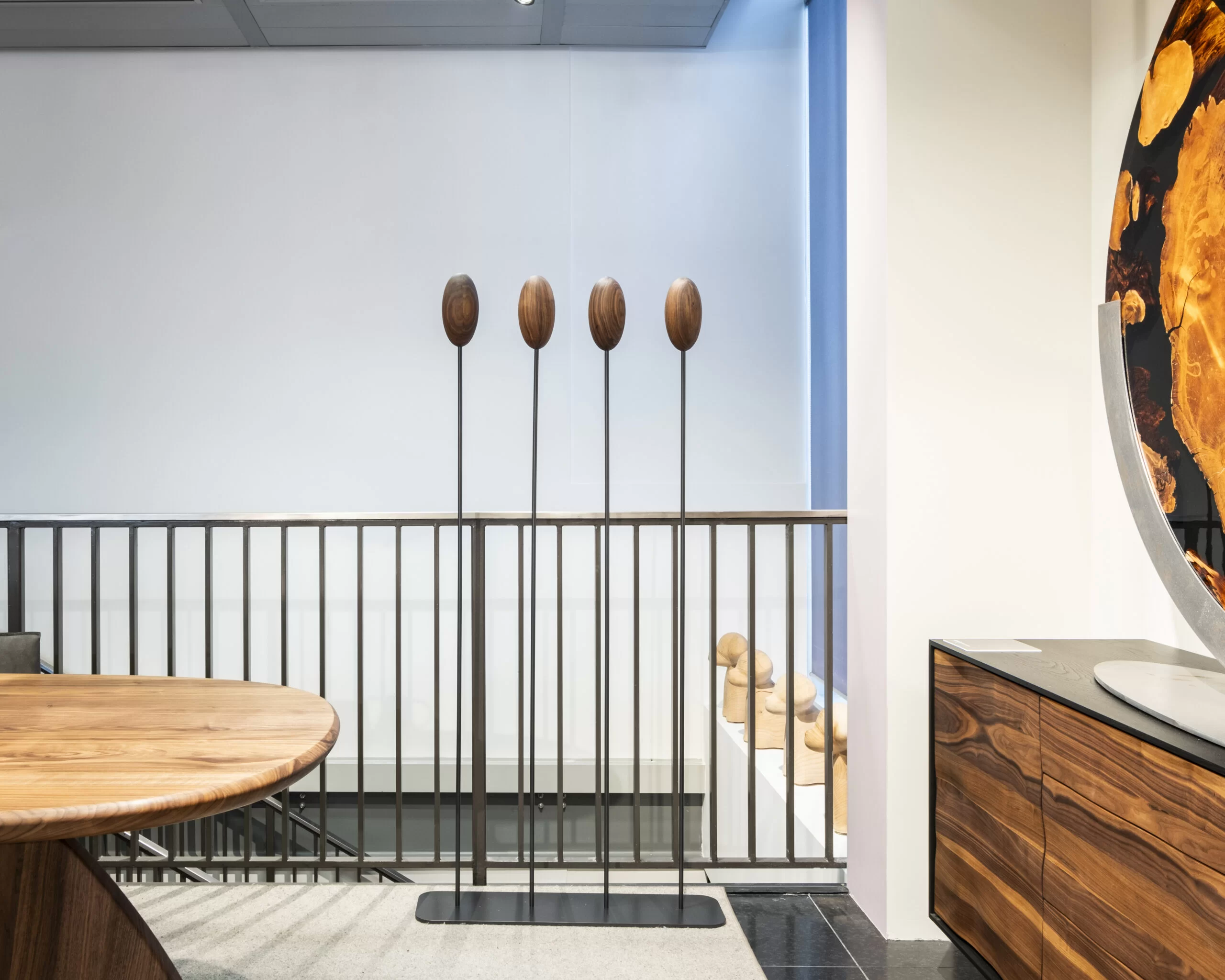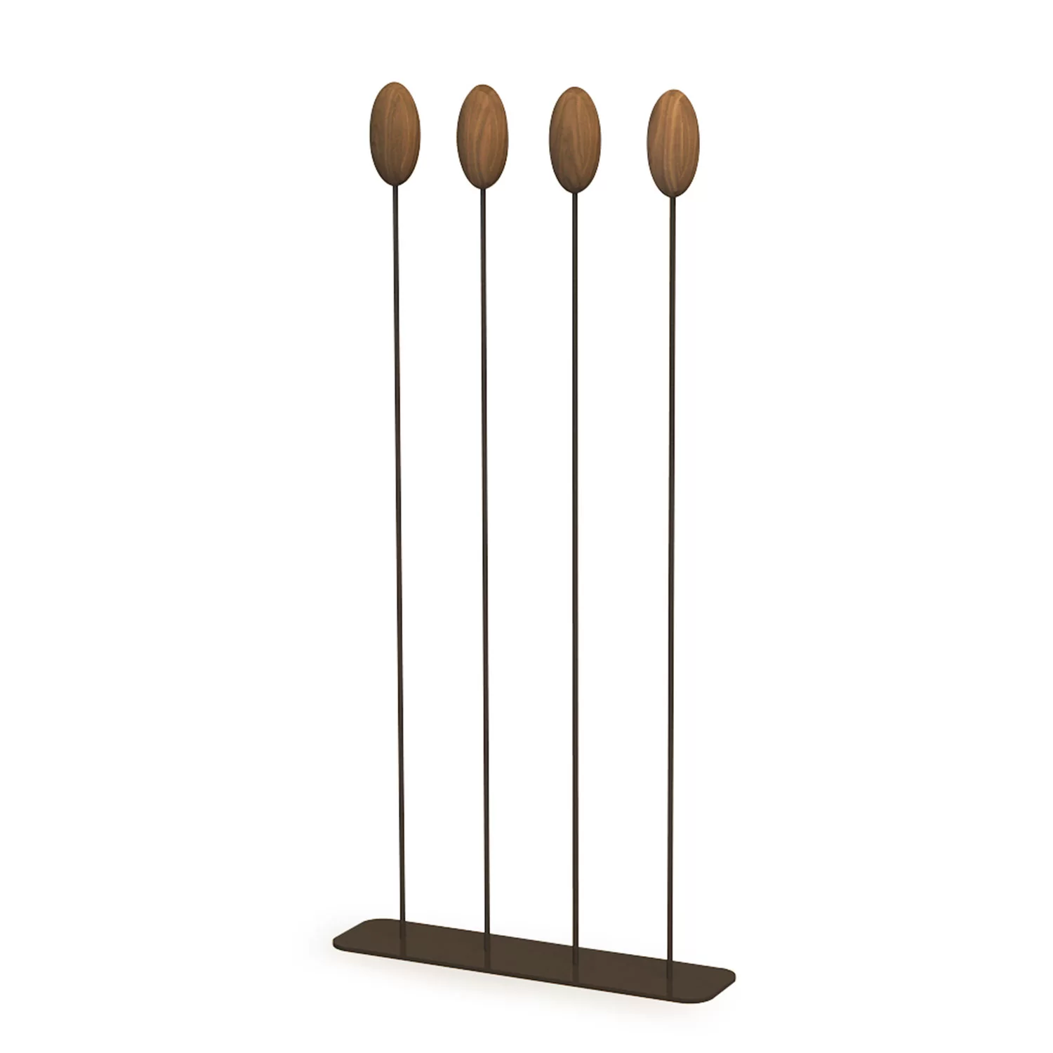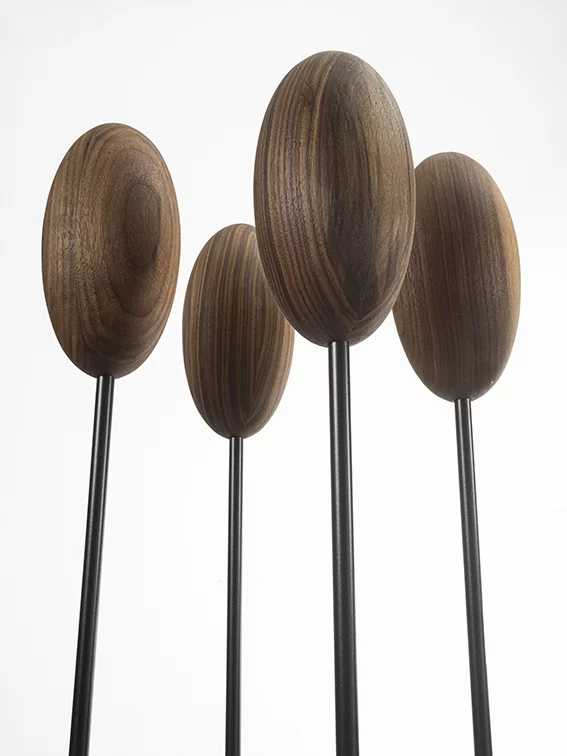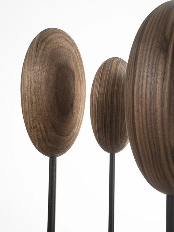 Appendiabiti con basamento e sostegni centrale verticali flessibili in ferro sormontati da un uovo realizzato in legno massello a liste incollate, che va a sostituire i classici ganci. Disponibile in due versioni: con basamento quadrato o rettangolare.
