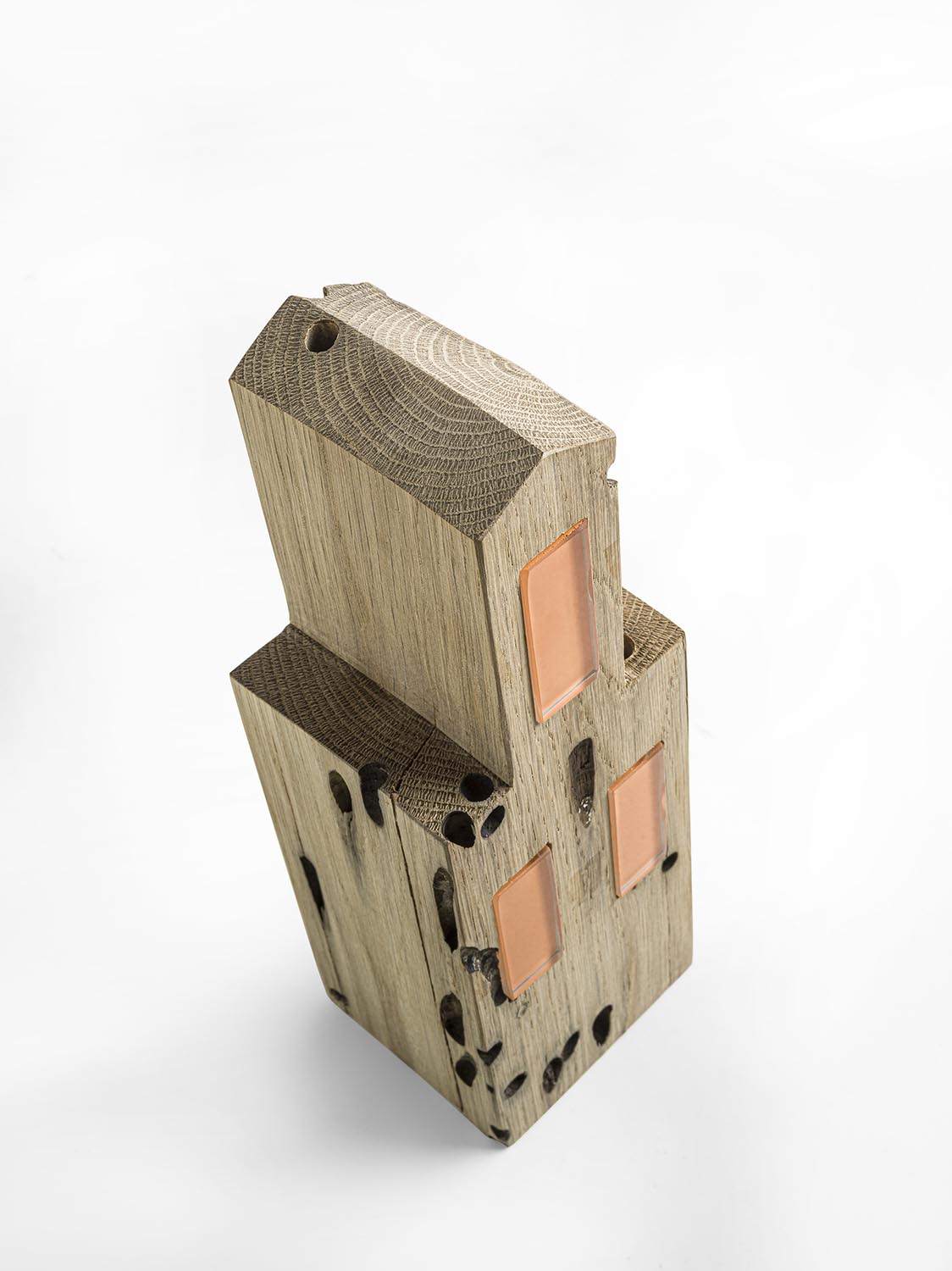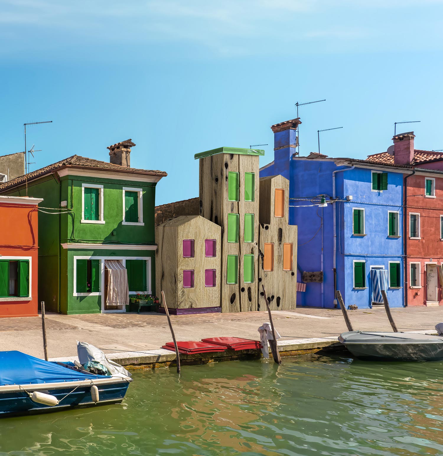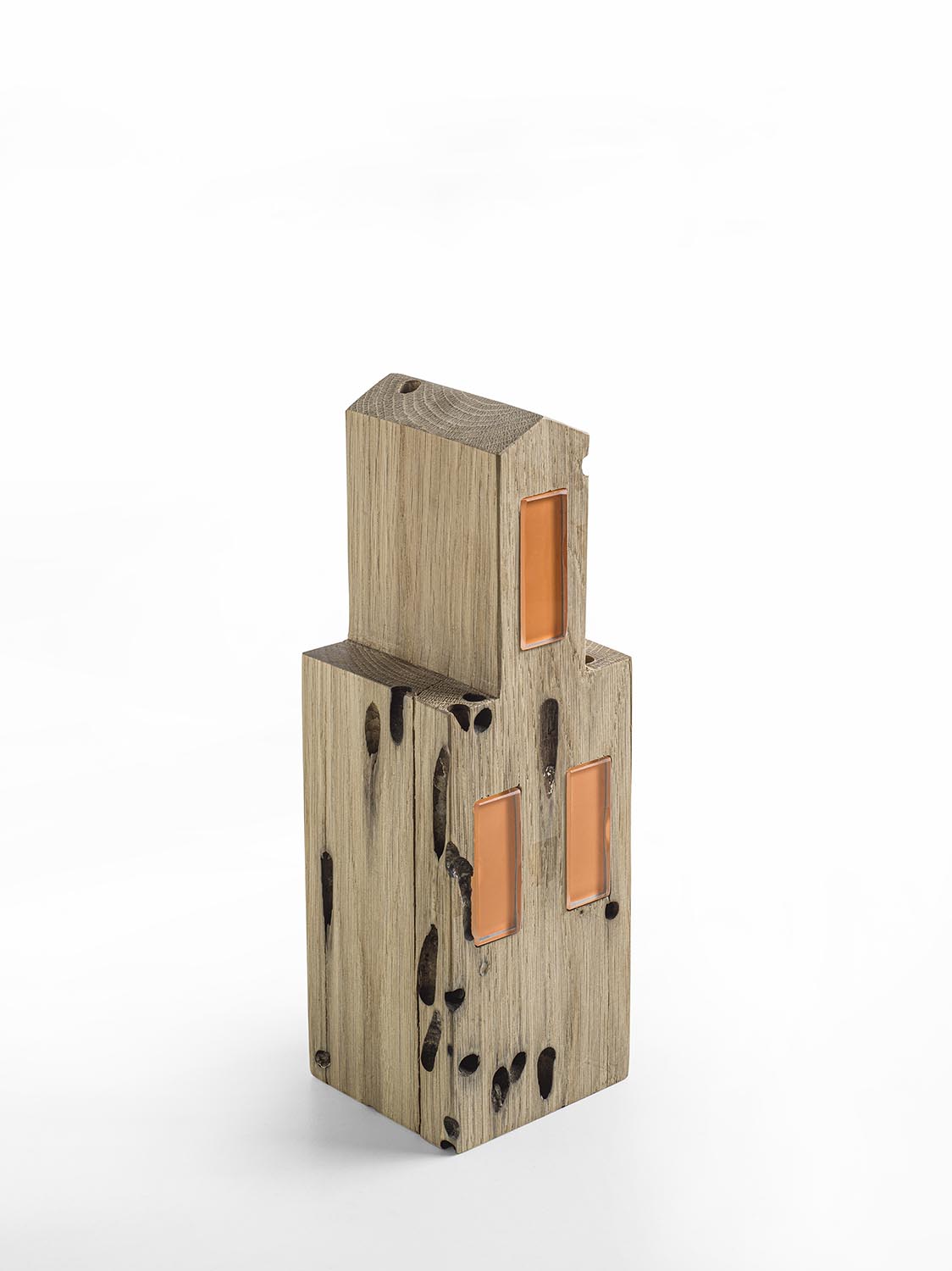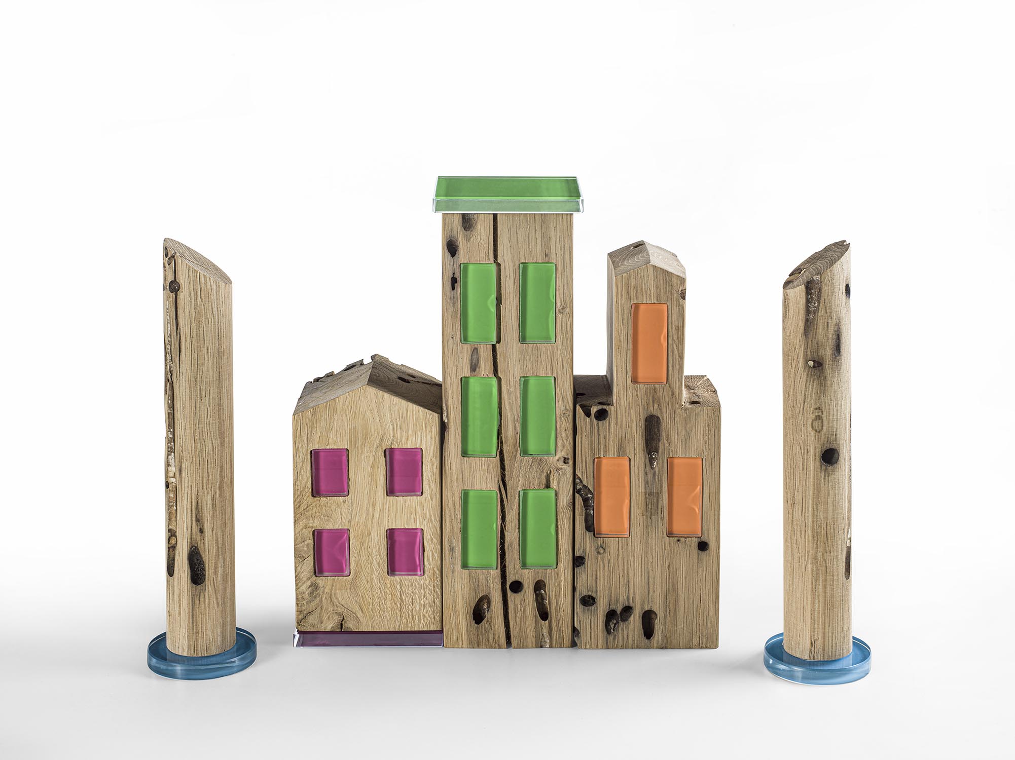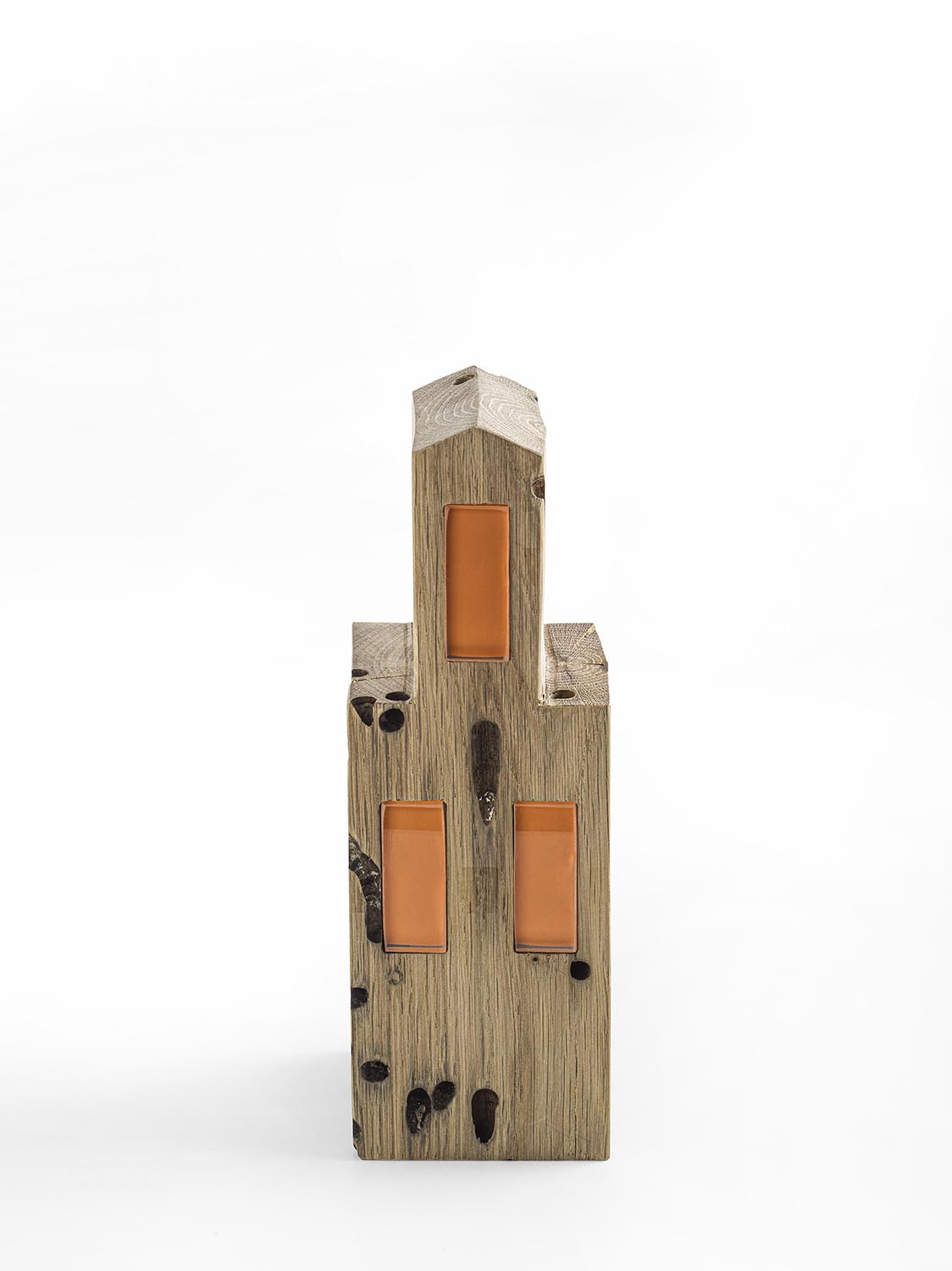 Complemento d’arredo in Briccola con dettagli a contrasto in vetro laccato color arancione. Il design si ispira all’architettura della città di Burano.