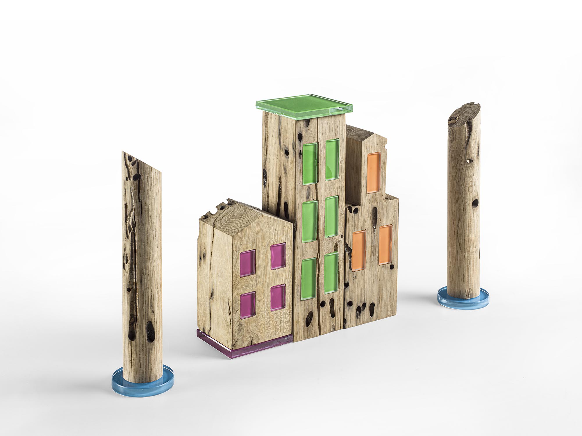 Set composto da cinque complementi d’arredo realizzati in Briccola, simbolo della tradizione veneziana. La collezione comprende tre casette (CÀ_1, CÀ_2 e CÀ_3), ognuna con forma e altezza diverse, arricchite da inserti in vetro laccato colorato che creano eleganti contrasti materici. Il design trae ispirazione dall’architettura tipica dell’isola di Burano, reinterpretata in chiave artistica per valorizzare il legno e i vibranti colori della città lagunare. A completare la collezione, due pali in Briccola (BRÌCOLA) con basamento in vetro laccato colorato, che richiamano i celebri elementi della laguna veneziana.