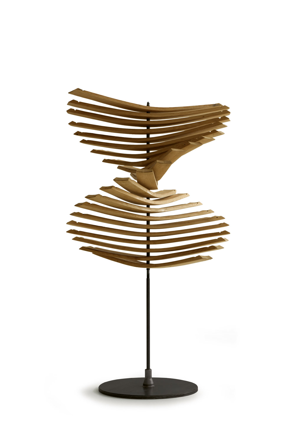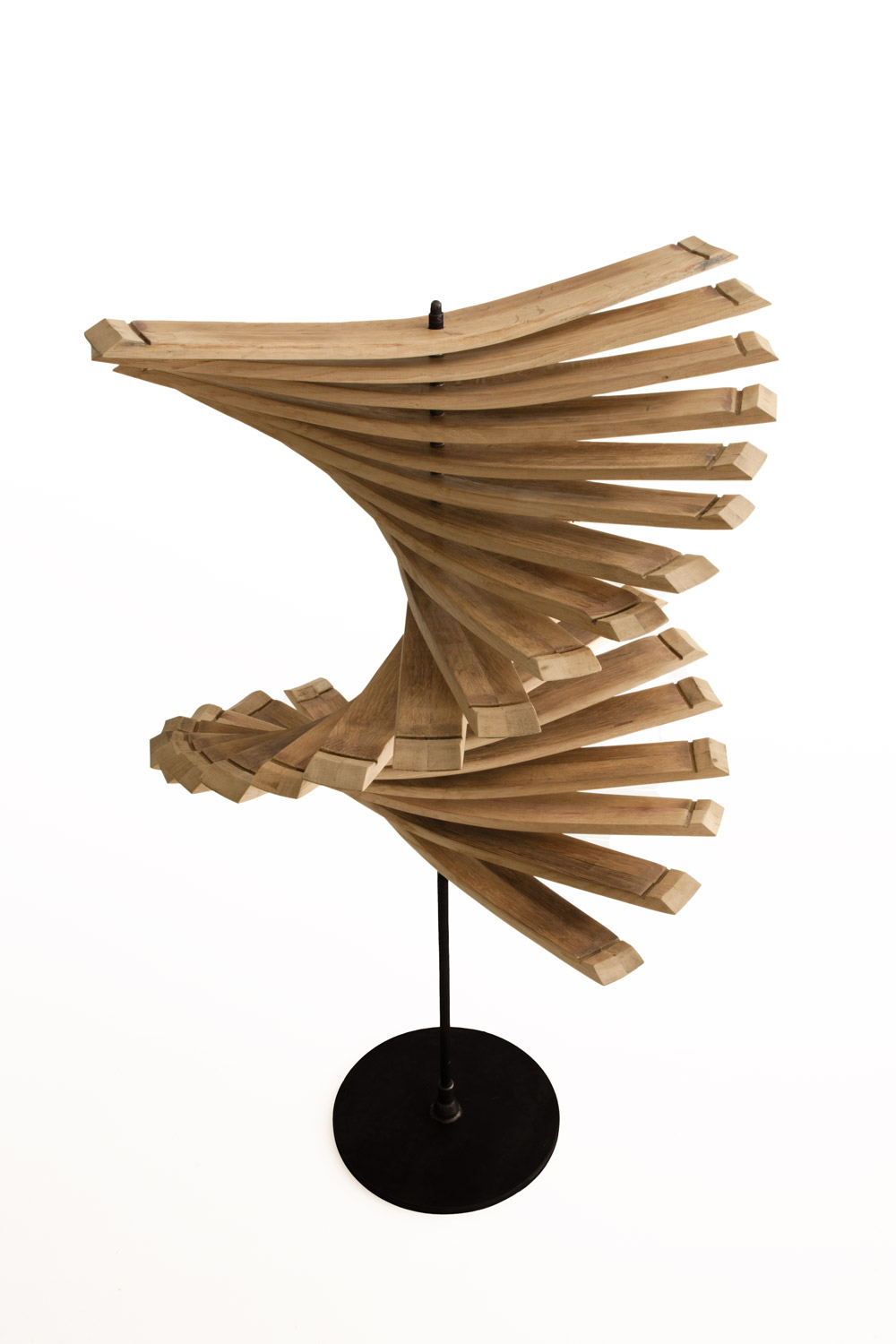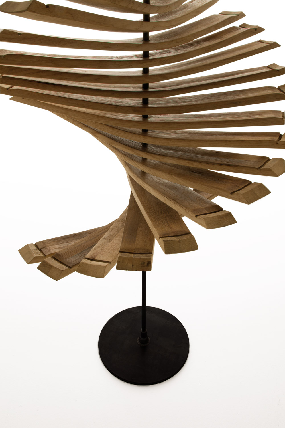 Elemento decorativo realizzato con doghe in legno di rovere provenienti dalle Barrique, unite tra loro da una struttura centrale con basamento in ferro. Muovendo le doghe si possono ottenere forme libere e dinamiche.