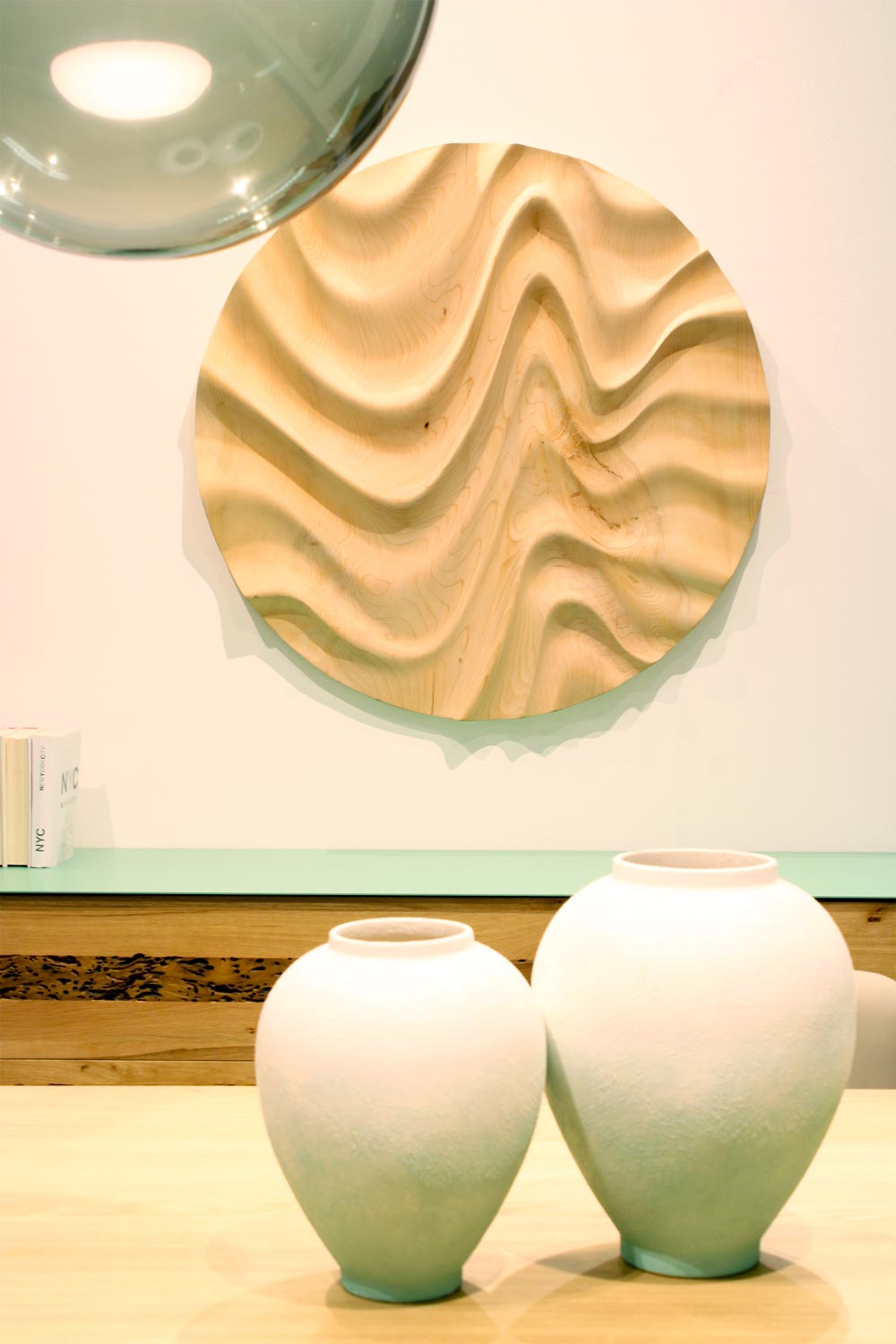 Decorazione scultorea a muro in legno massello di cedro a liste incollate. Le linee sinuose in rilievo creano un gioco di volumi e geometrie originale e raffinato, che esprime tutta l’unicità di un'arte che si lascia ispirare dalle mille forme della natura.