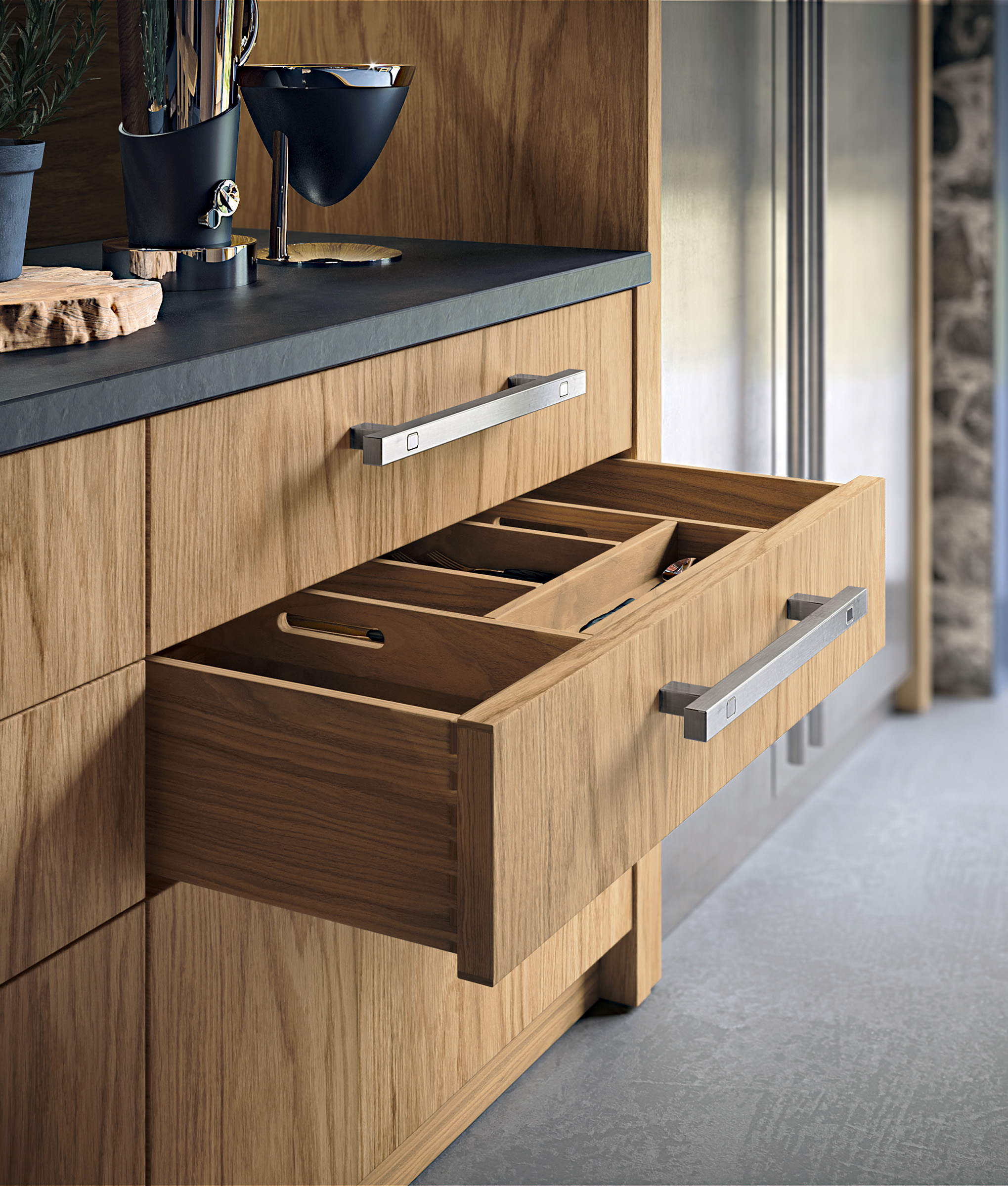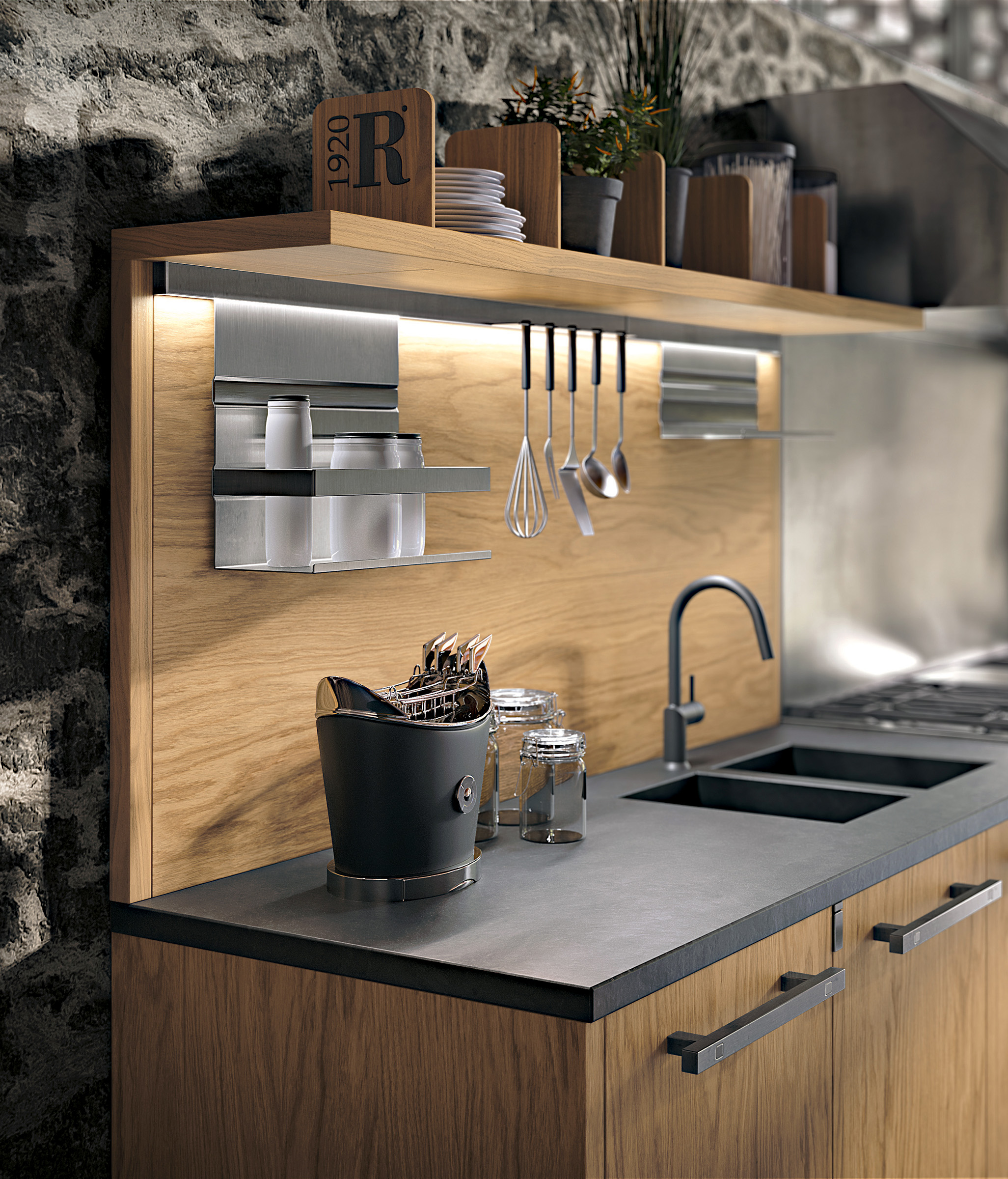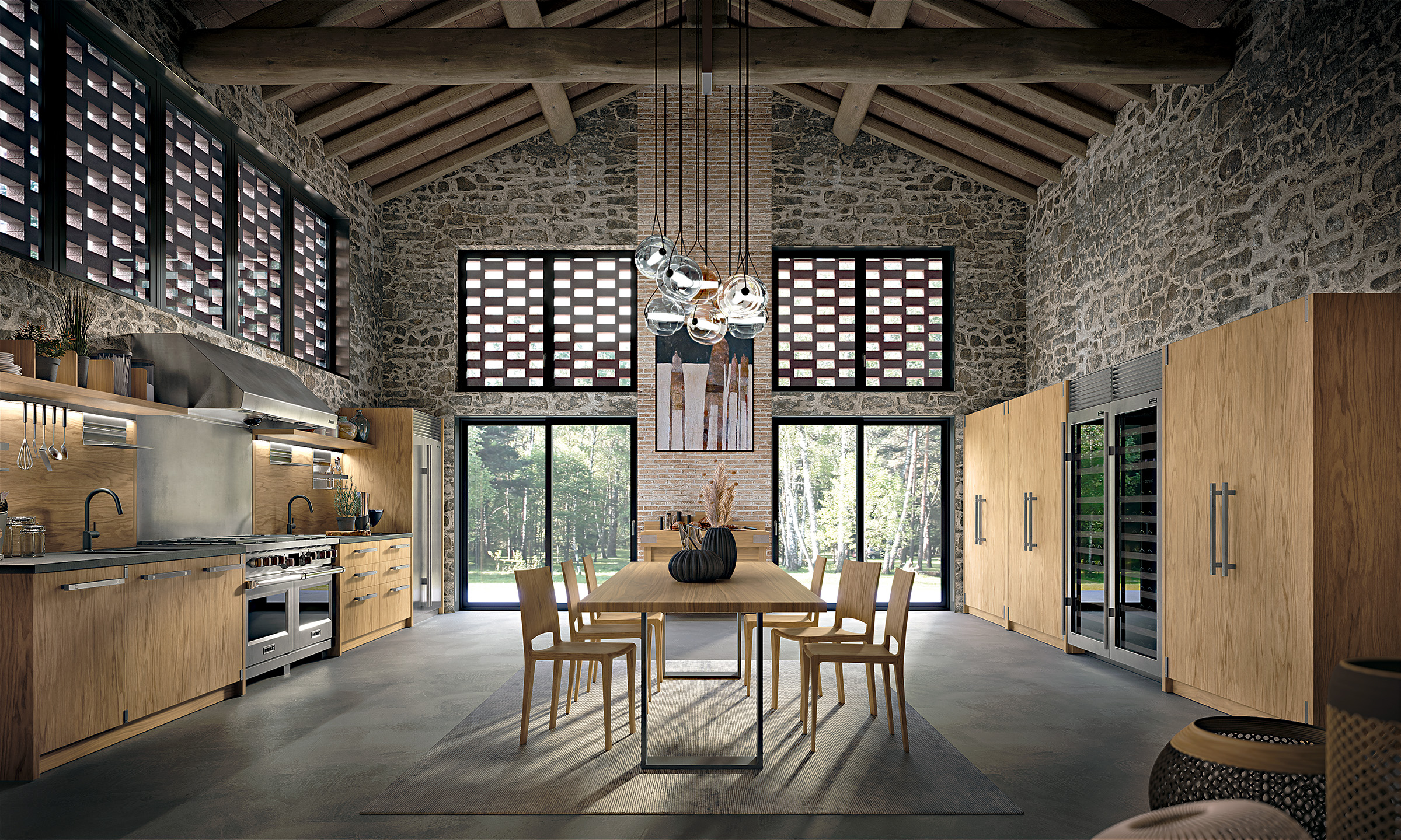 Si tratta di una cucina la cui struttura nasce sulla base dell’impostazione di quella semiprofessionale, modulare e oversize. Ogni elemento è pensato, progettato e prodotto per rispondere alle più sofisticate esigenze del cucinare. Composta da basi con ante e cassetti, speciali mensole modulari e pensili con ante a battente. Corredata da colonne dispensa attrezzate per riporre tutto in modo molto ordinato. A completamento della modularità della cucina, viene proposto un elemento ad isola bifacciale, con lato “snack” integrato. Elementi jolly due ceppi di cui uno tradizionale, ovvero più alto del piano cucina e con il legno di testa per lavorare la carne, e un secondo “alla francese”, dotato di cassetto e portacoltelli, con funzione di isola di lavoro. Un progetto in cui il design minimale incontra la tradizione del legno massello e si caratterizza per una serie di soluzioni innovative sia a livello funzionale che estetico, è la cucina per veri amateurs della cultura del buon cucinare e del buon vivere.