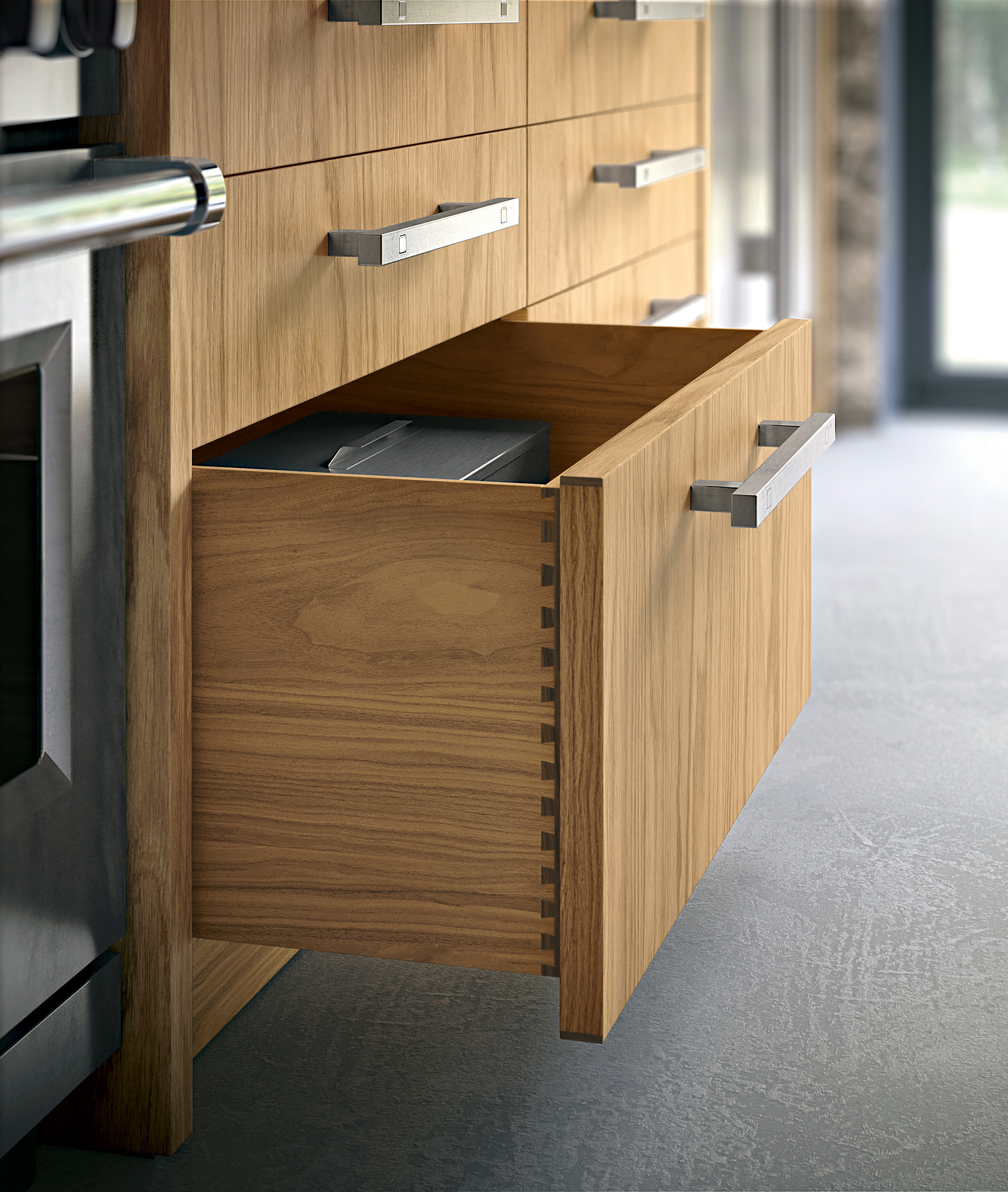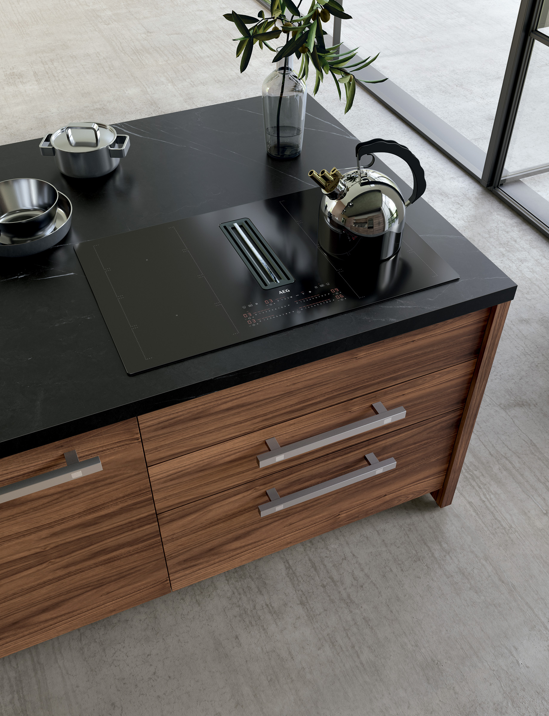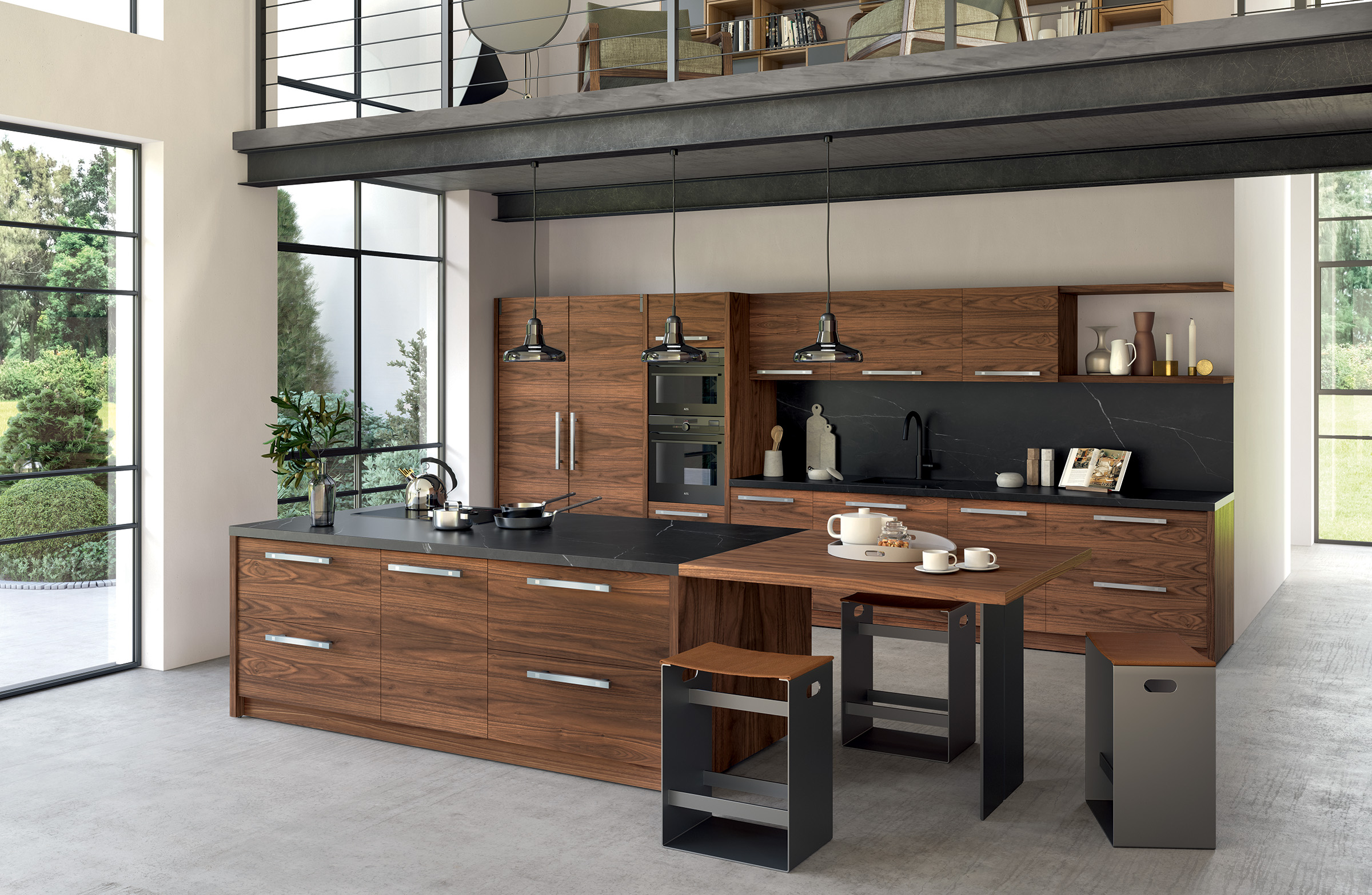 Si tratta di una cucina la cui struttura nasce sulla base dell’impostazione di quella semiprofessionale, modulare e oversize. Ogni elemento è pensato, progettato e prodotto per rispondere alle più sofisticate esigenze del cucinare. Composta da basi con ante e cassetti, speciali mensole modulari e pensili con ante a battente. Corredata da colonne dispensa attrezzate per riporre tutto in modo molto ordinato. A completamento della modularità della cucina, viene proposto un elemento ad isola bifacciale, con lato “snack” integrato. Elementi jolly due ceppi di cui uno tradizionale, ovvero più alto del piano cucina e con il legno di testa per lavorare la carne, e un secondo “alla francese”, dotato di cassetto e portacoltelli, con funzione di isola di lavoro. Un progetto in cui il design minimale incontra la tradizione del legno massello e si caratterizza per una serie di soluzioni innovative sia a livello funzionale che estetico, è la cucina per veri amateurs della cultura del buon cucinare e del buon vivere.