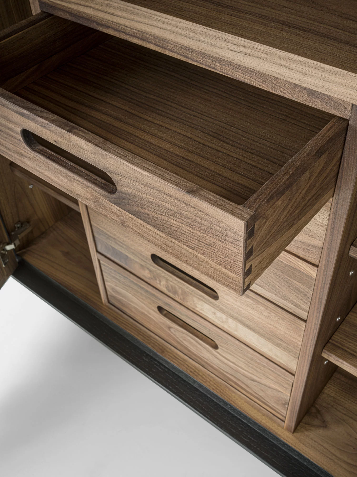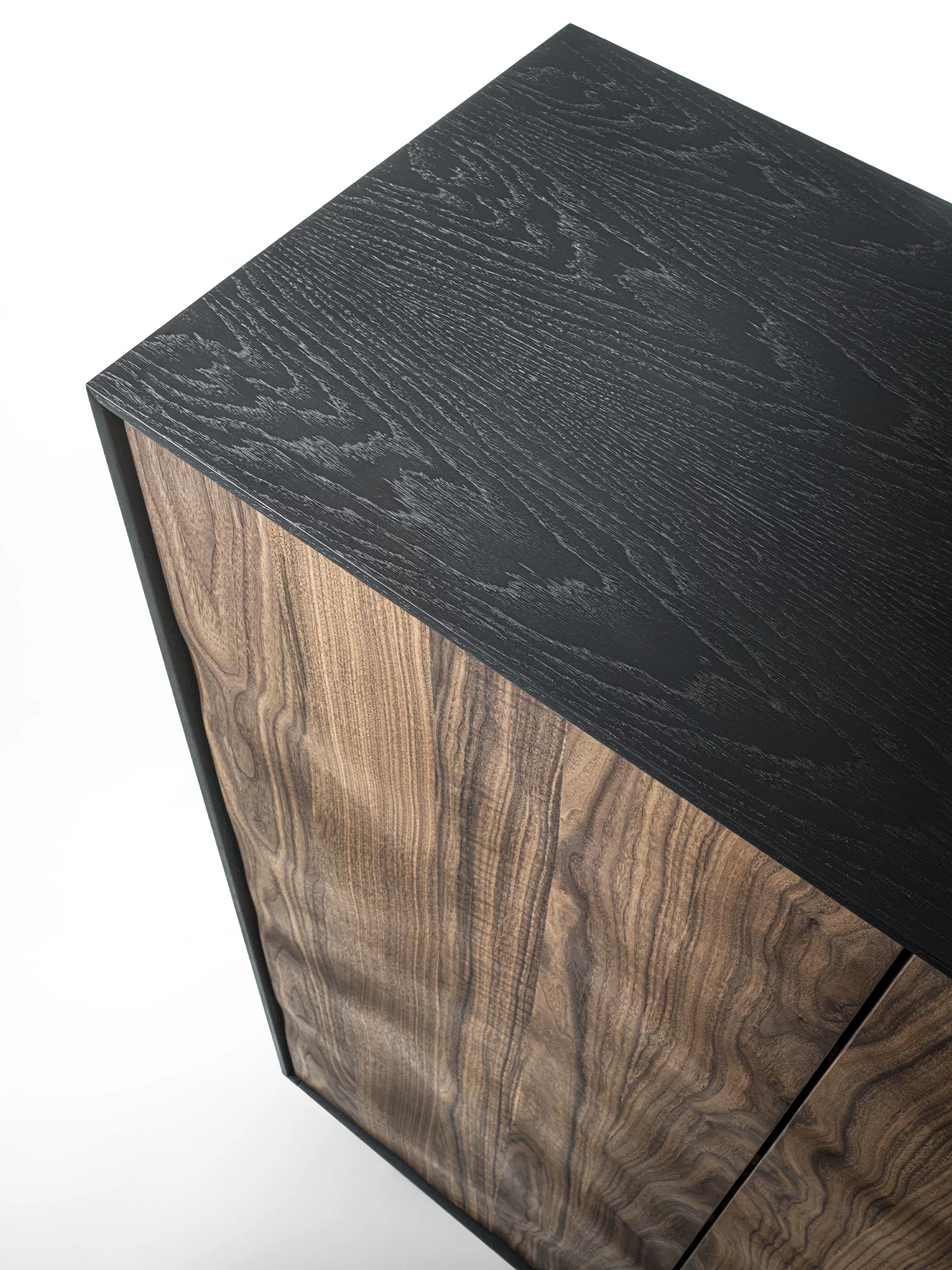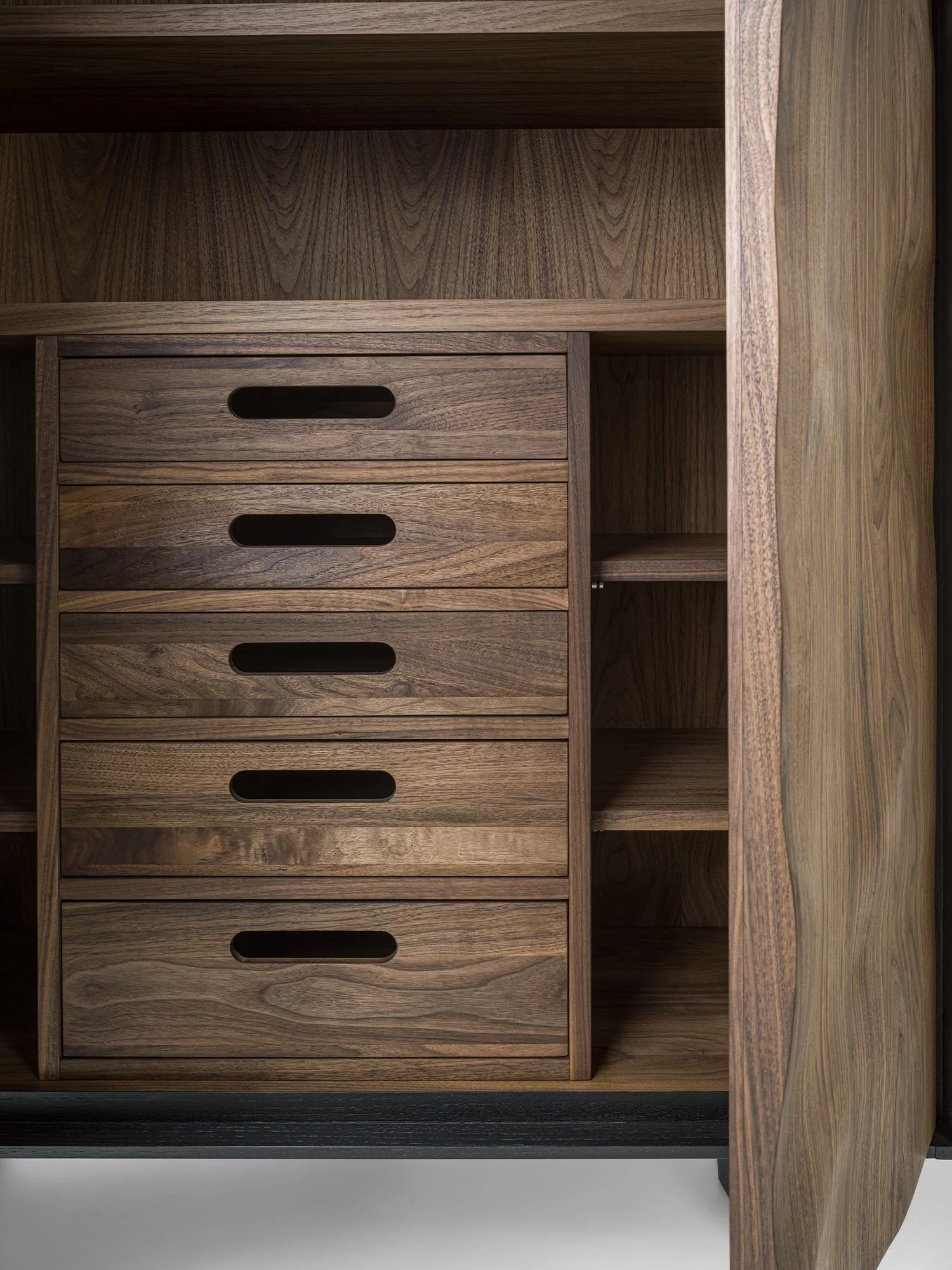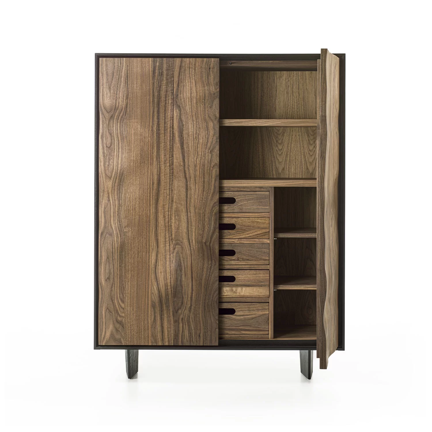 Credenza alta in legno massello e listellare, racchiusa da cornice in legno. All’interno ripiani e cassetti assemblati con tradizionali incastri a coda di rondine e maniglia fresata passante. La particolare lavorazione sulle ante crea un effetto scultoreo attraverso l’estroflessione del legno, donandole un movimento sinuoso.