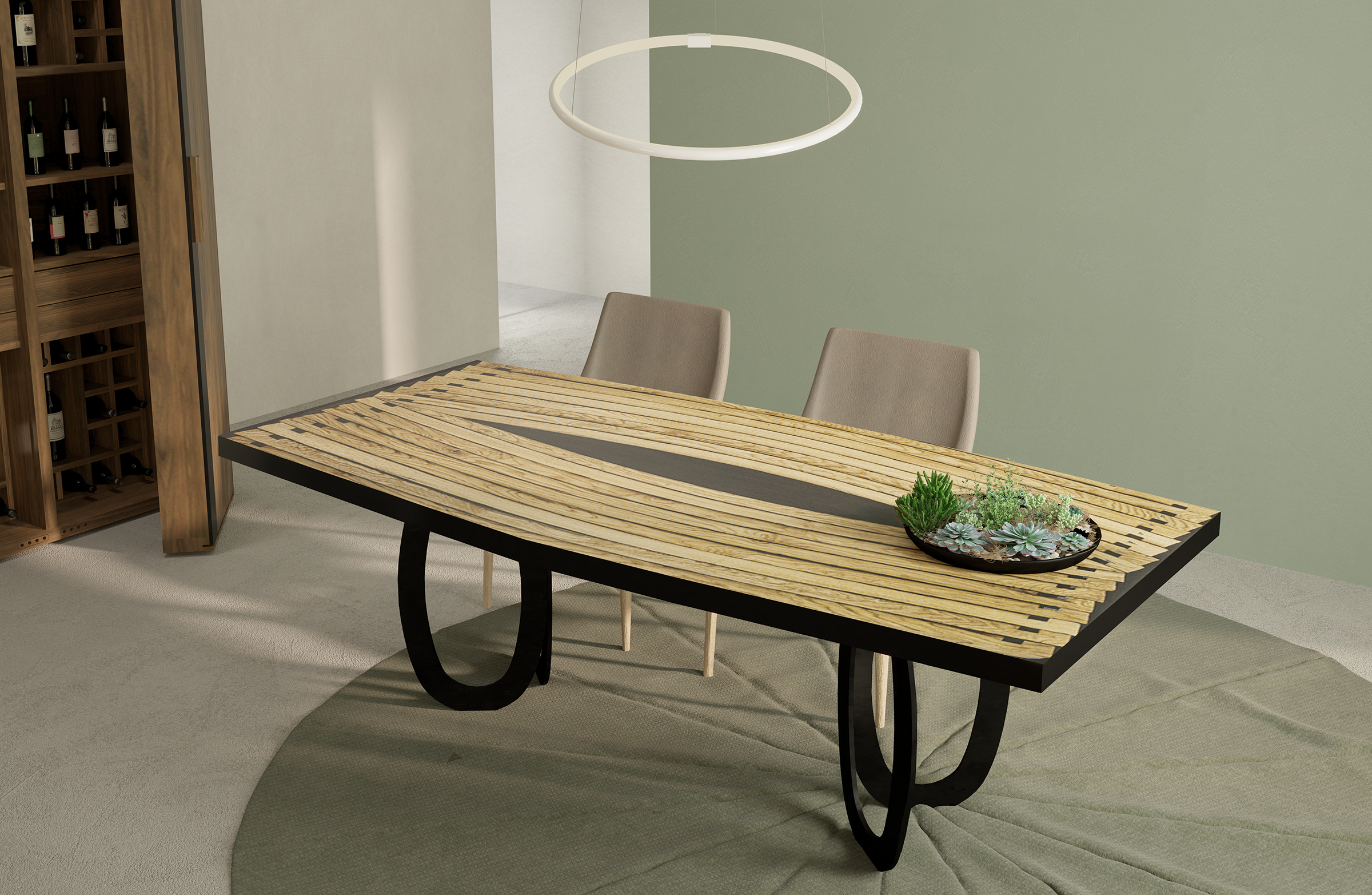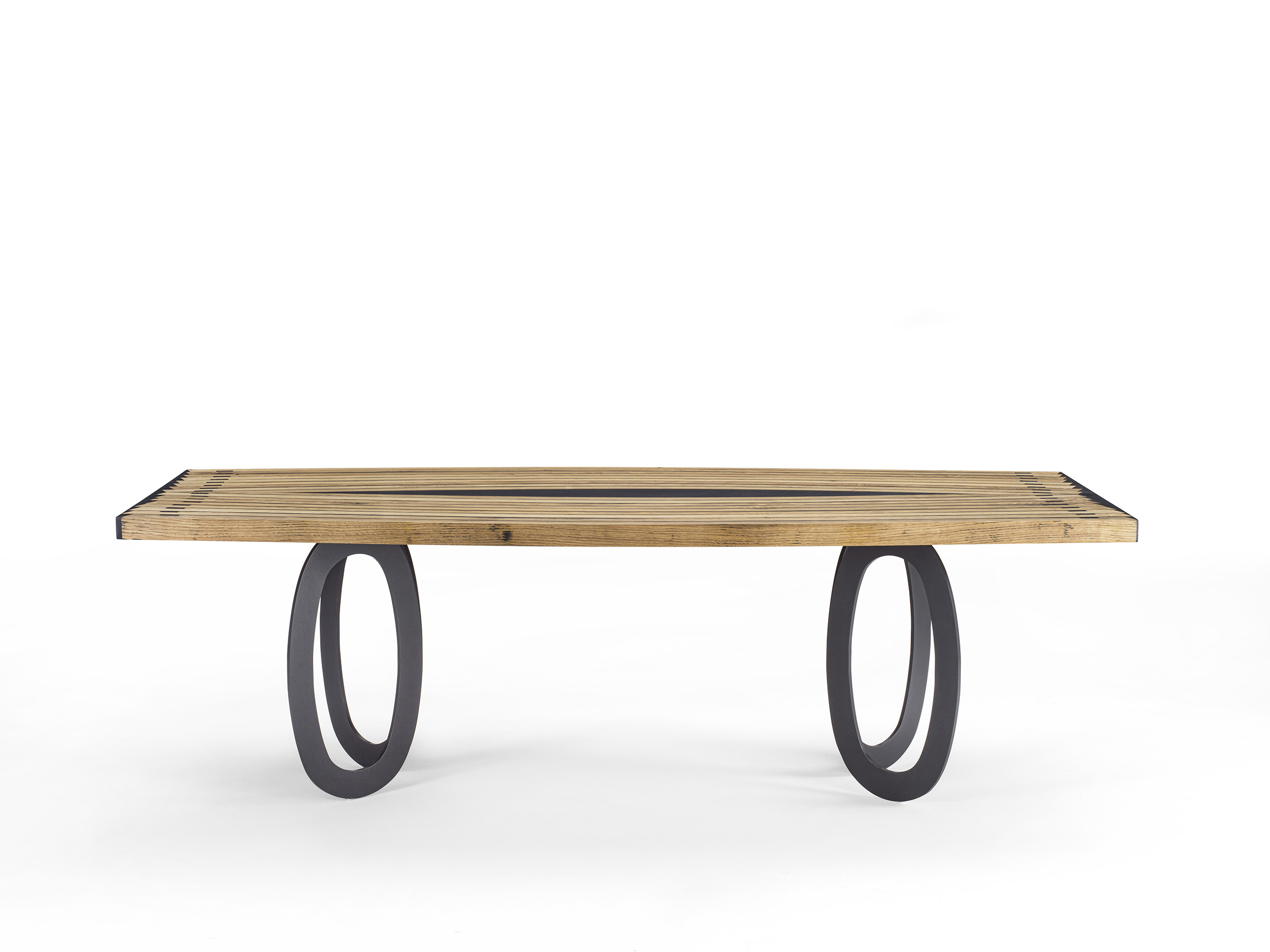 Il tavolo presenta un top costituito dall’accostamento di più doghe ricurve intervallate da inserti di resina nera. Le gambe, composte ciascuna da due anelli ovali in ferro, riprendono la forma curva delle doghe del top.