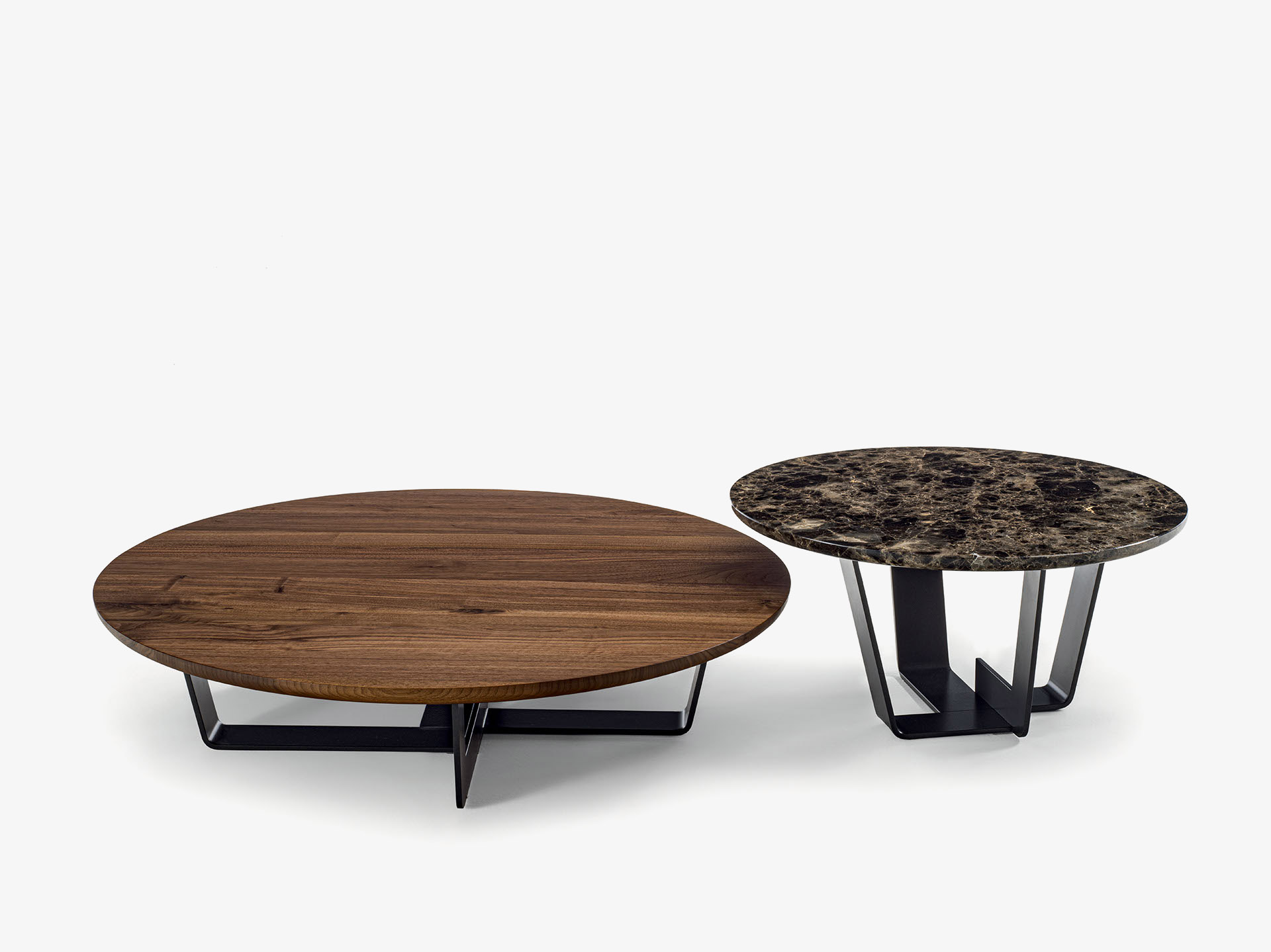Tavolini rotondi realizzati con top in marmo abbinato ad una base in ferro. Disponibili in diverse altezze e dimensioni, con possibilità di essere collocati l’uno sotto l’altro.