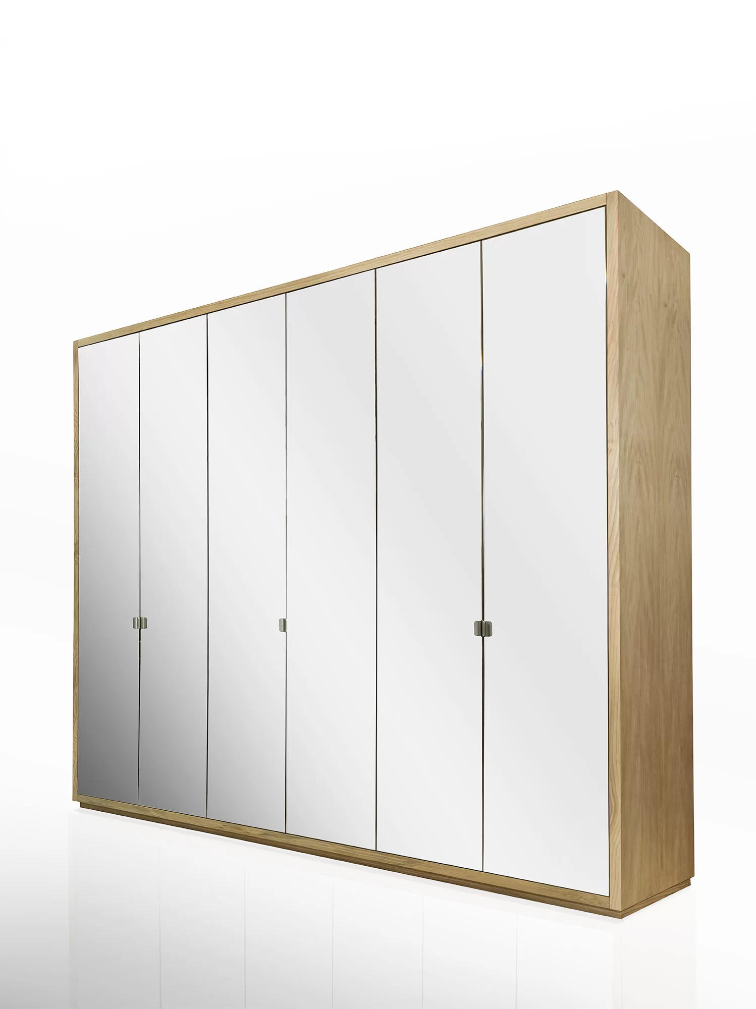 Armadio in legno massello e listellare, caratterizzato da ante battenti a specchio e telaio in legno massello, con interni in legno di cedro profumato, naturale rimedio contro le tarme. Personalizzabile con l’inserimento di appendiabiti, ripiani, cassettiere in legno massello con tradizionale incastro a coda di rondine e accessori vari, propone un’organizzazione funzionale e componibile dei vari elementi sulla base delle esigenze contenitive e delle dimensioni richieste.