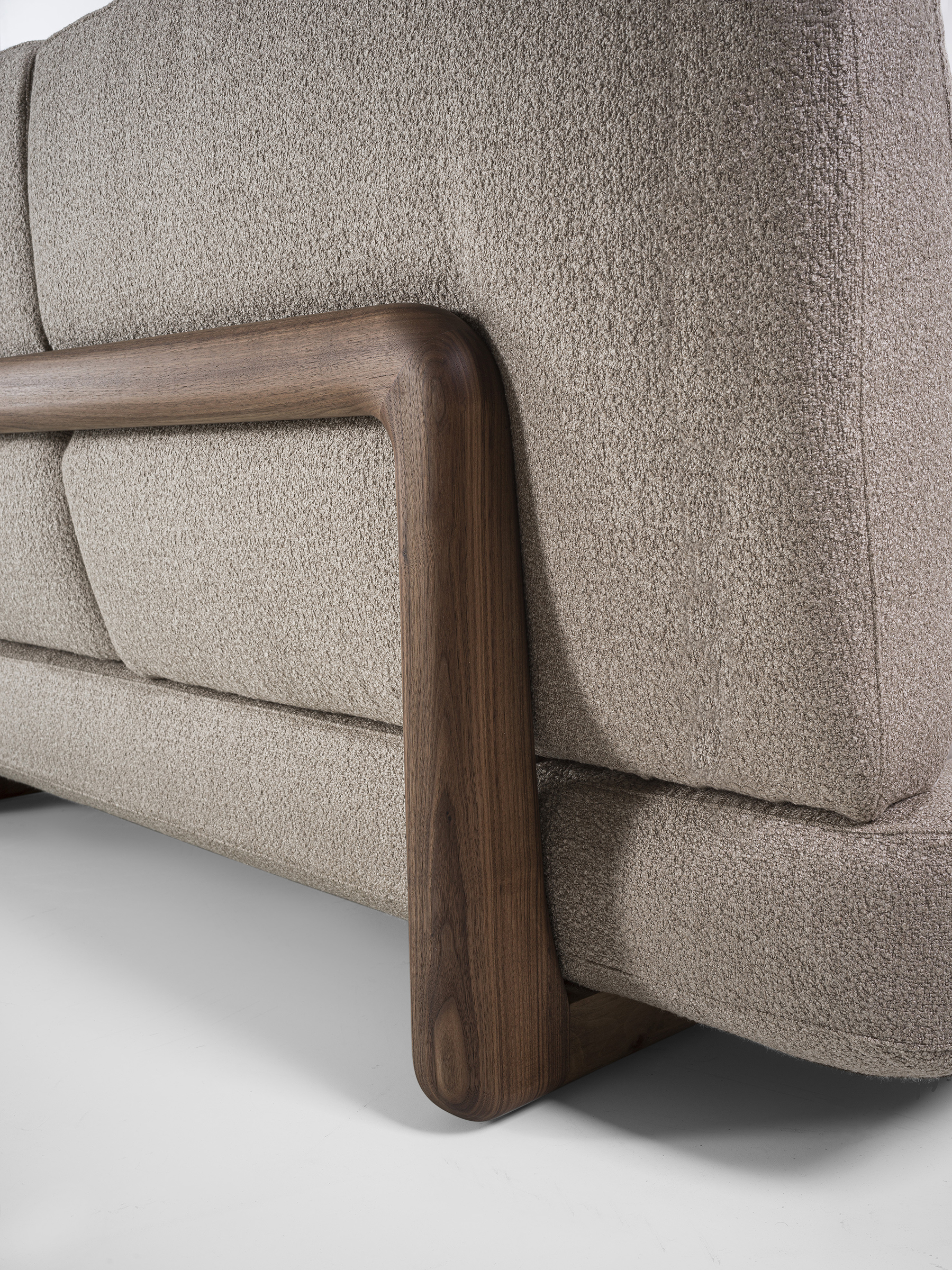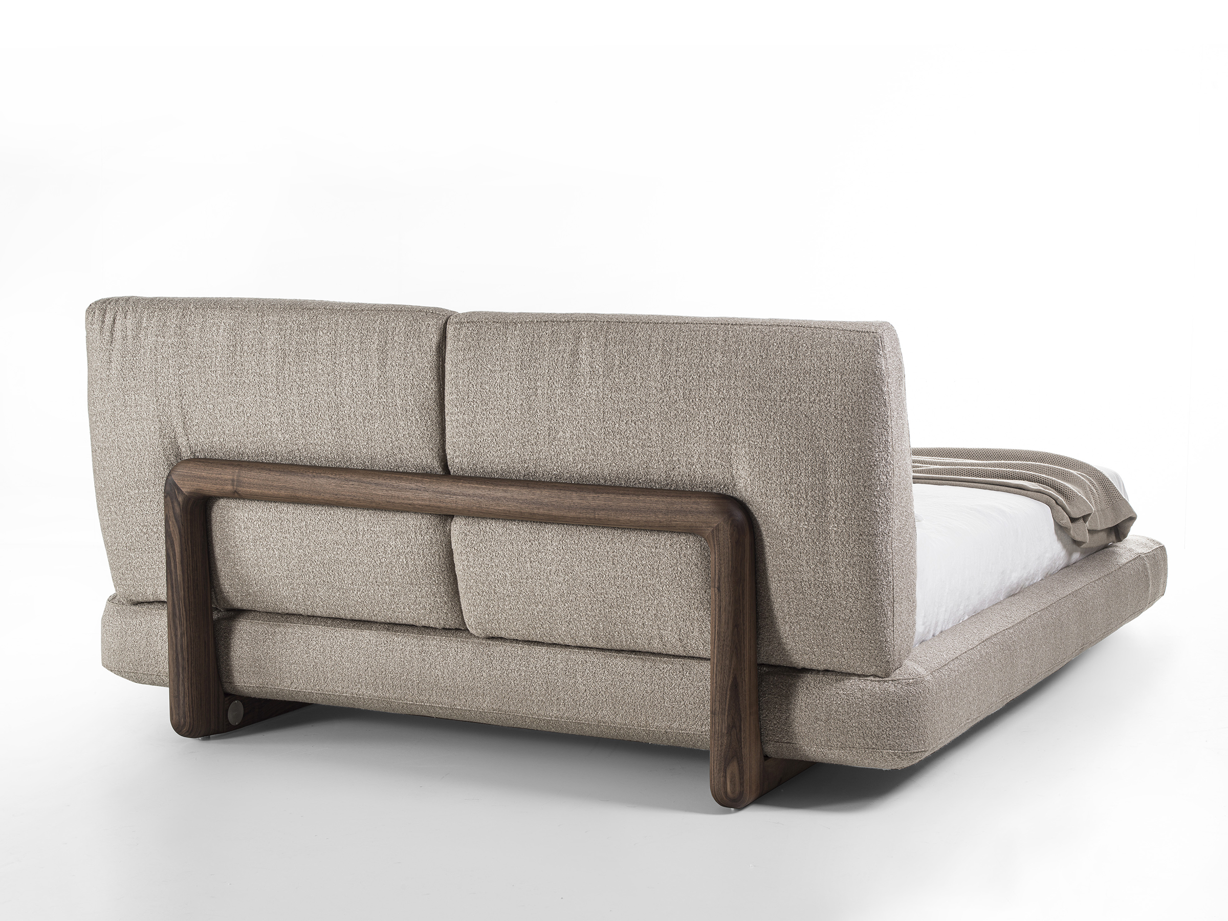Letto con struttura che nasce dall’unione di due componenti dalle linee morbide e arrotondate: il basamento in legno massello che accoglie un giroletto imbottito. In abbinata una testata imbottita rivestita in pelle o tessuto.