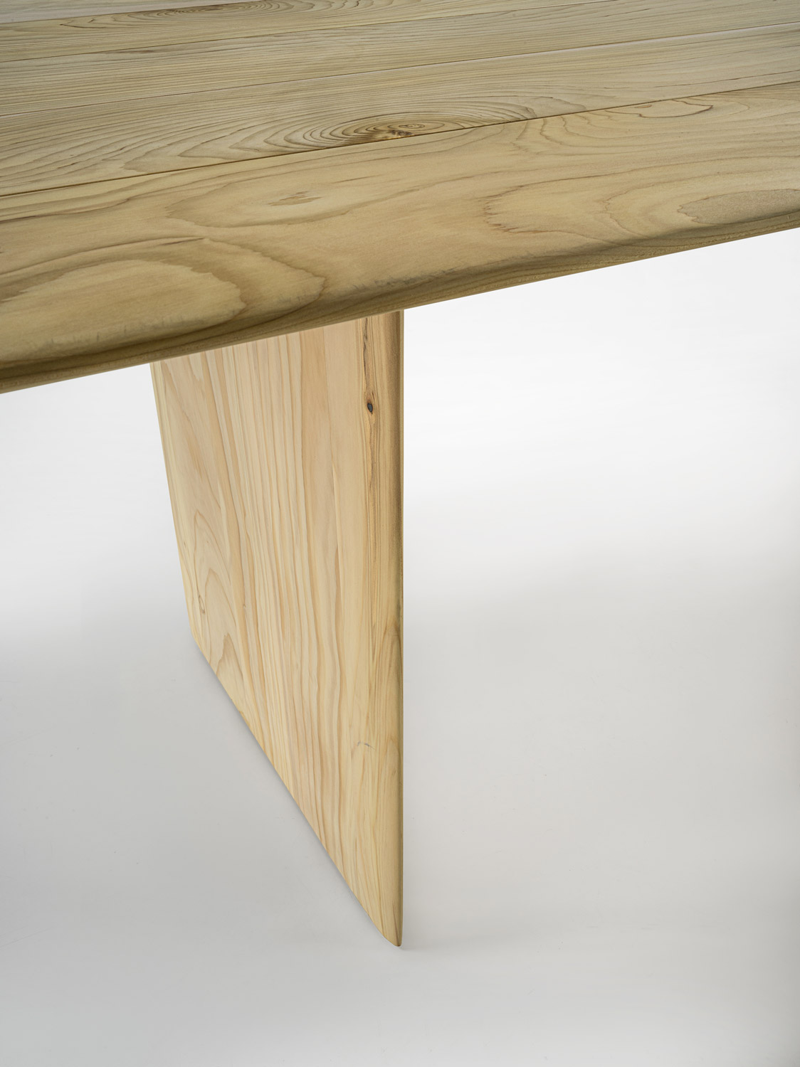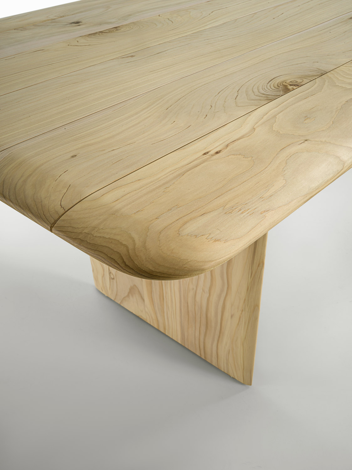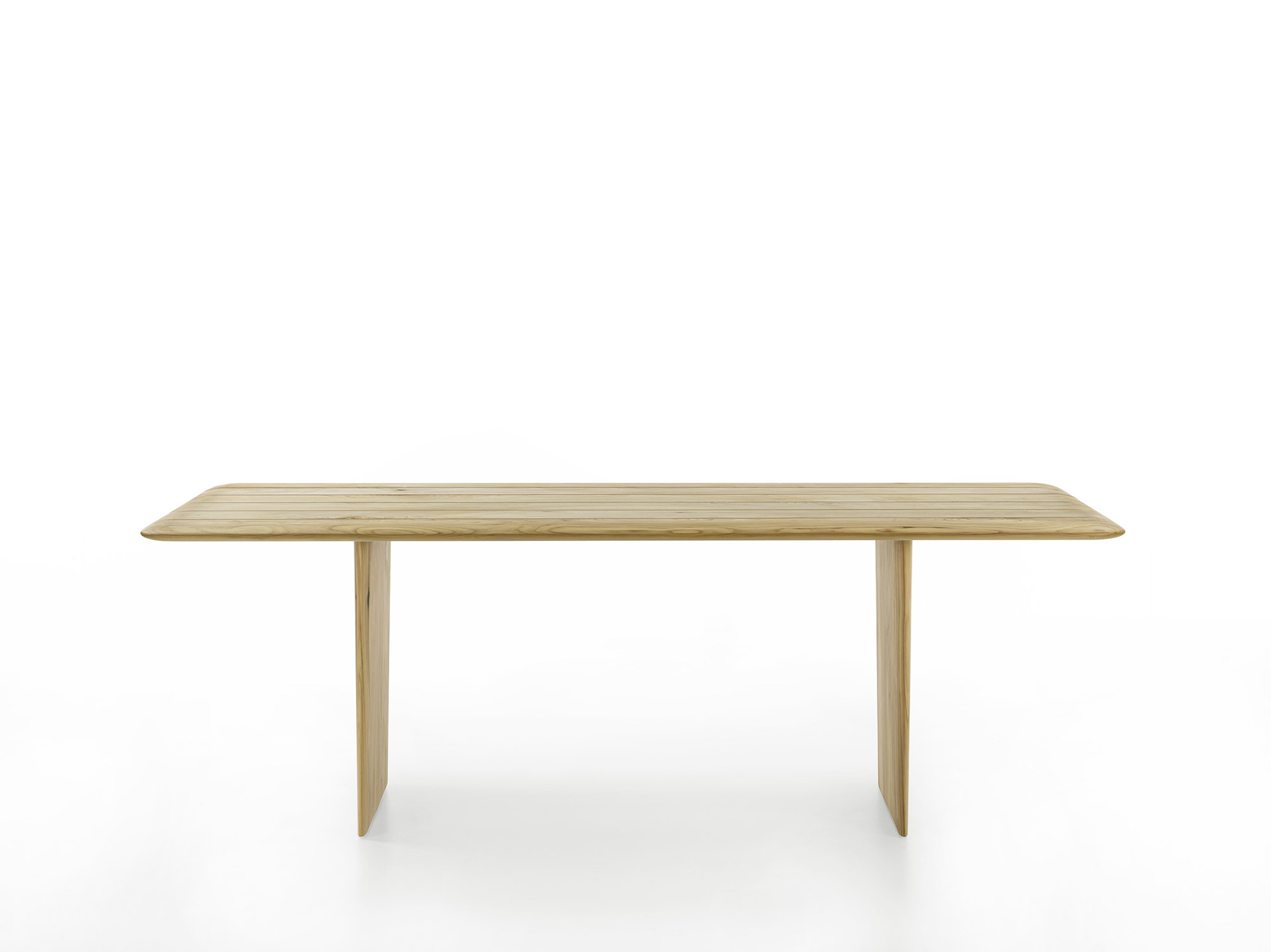 Versione per outdoor in legno massello di cedro profumato del Libano, con i classici lati stondati e caratterizzato da top e gambe con spessori assottigliati tramite lavorazione a saponetta, che donano leggerezza e sinuosità; inoltre il top è costituito da liste accostate.