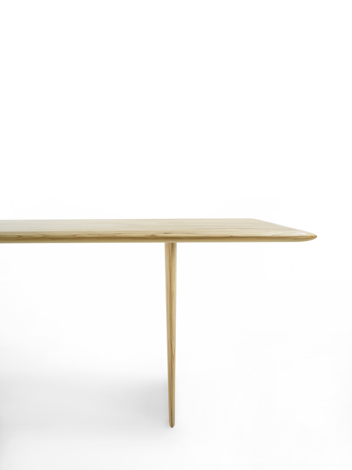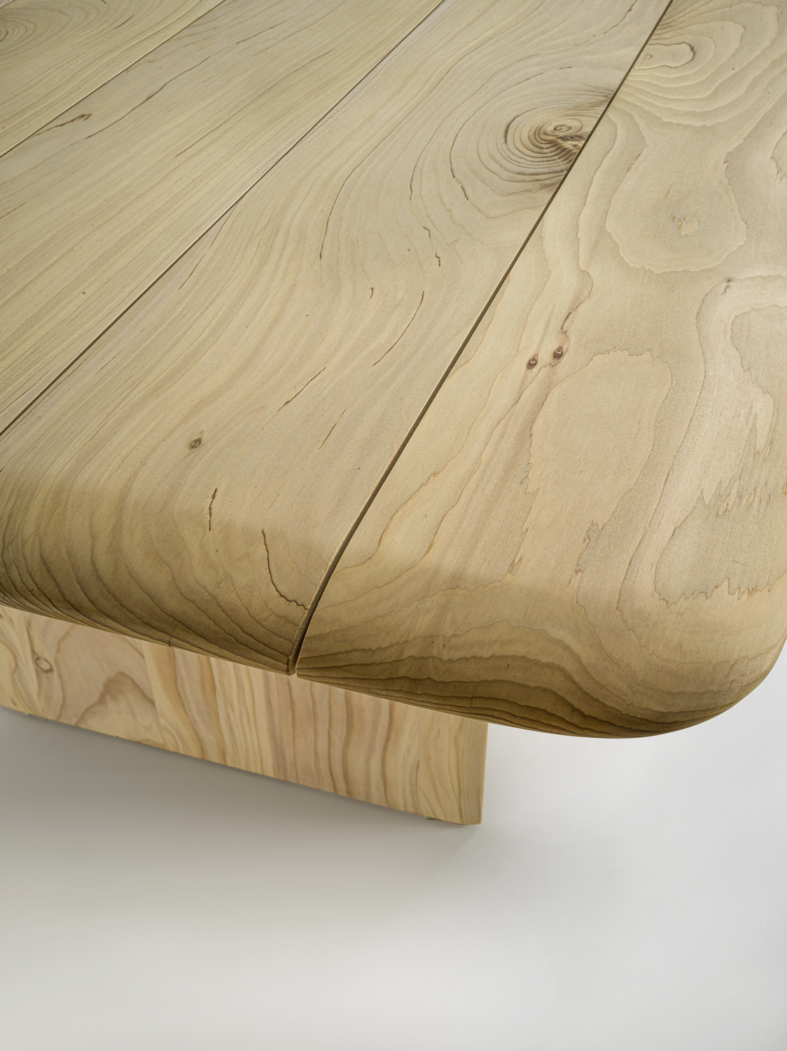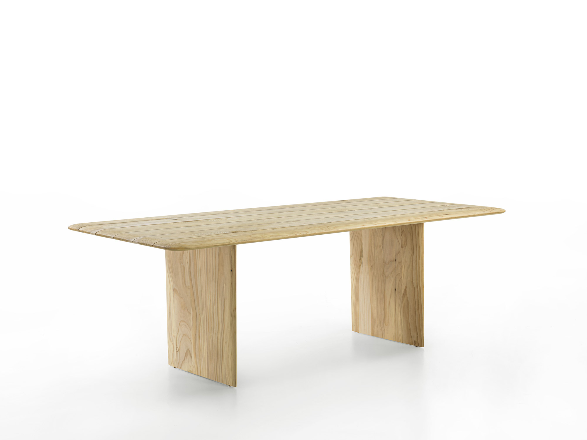 Versione per outdoor in legno massello di cedro profumato del Libano, con i classici lati stondati e caratterizzato da top e gambe con spessori assottigliati tramite lavorazione a saponetta, che donano leggerezza e sinuosità; inoltre il top è costituito da liste accostate.
