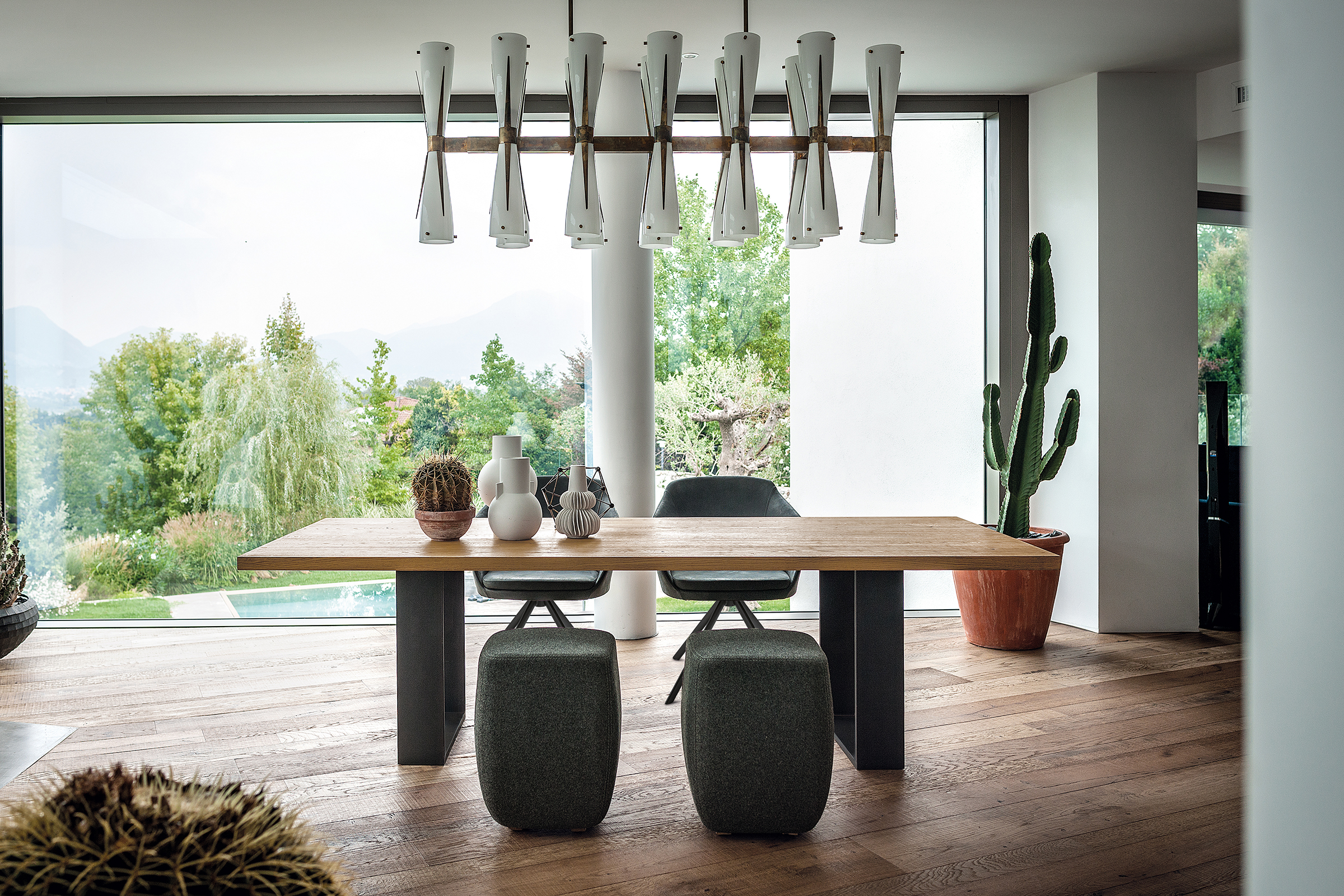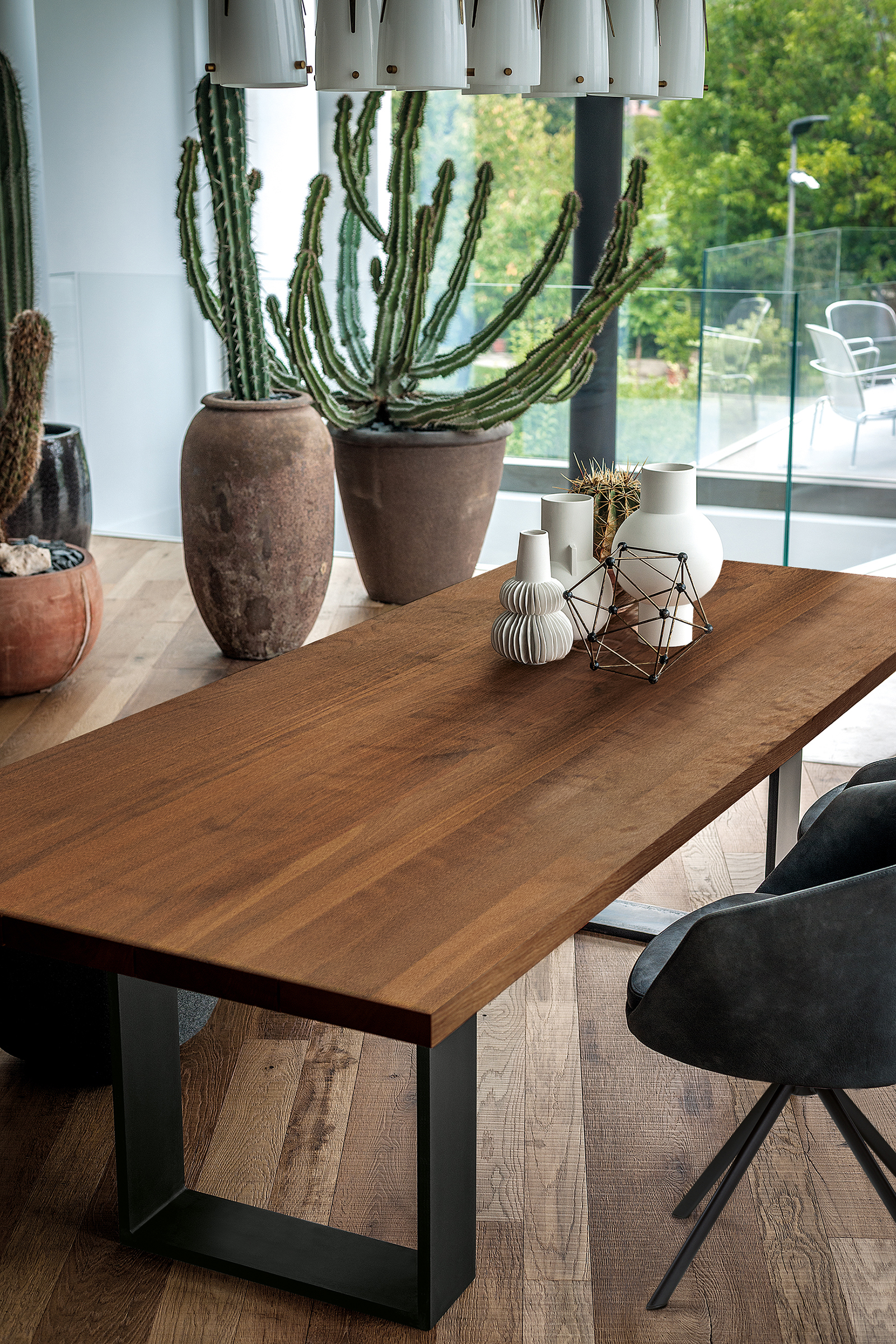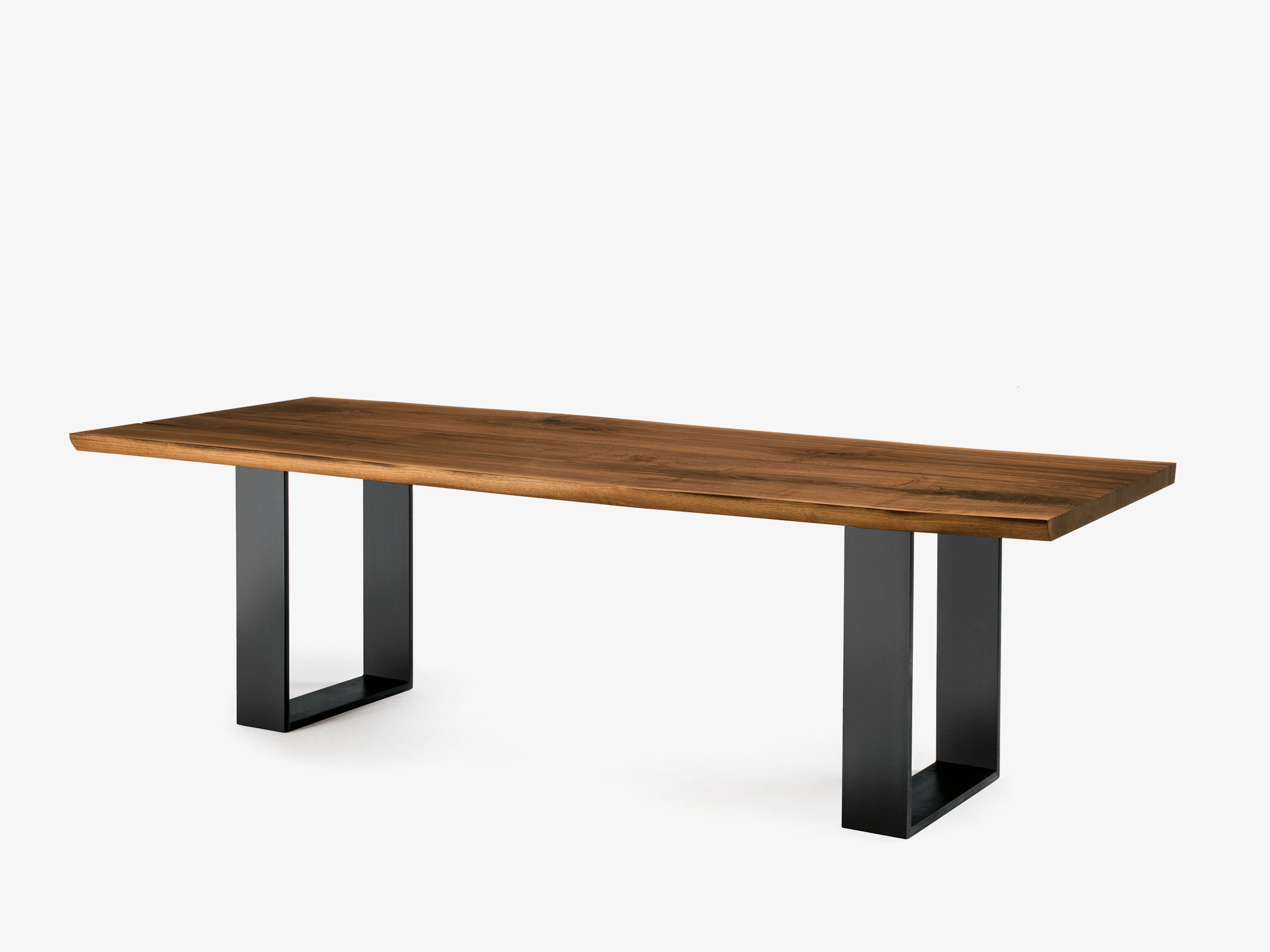 Стол со столешницей из массива дерева с клееными досками с прямоугольными краями, в сочетании с железными ножками.